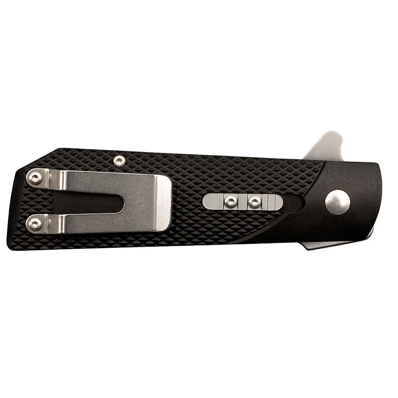 Il porte le mĂȘme nom qu’un pistolet semi automatique, c’est le modĂšle 1911 signĂ© Cold Steel. Ce couteau pliant possĂšde une lame de 76mm de long en acier inoxydable 4034SS sur laquelle on peut justement apercevoir le nombre 1911, positionnĂ© juste Ă cĂŽtĂ© d’un bouton de pouce. Le flipper permet d’ouvrir la lame avec une grande facilitĂ©, le mĂ©canisme de verrouillage n’est autre que le cĂ©lĂšbre liner lock. La lame clip point est ultra-tranchante, vous pourrez compter sur elle lors des situations dĂ©licates, complexes. Le couteau 1911 Cold Steel possĂšde un manche noir en griv-ex, un matĂ©riau fortement utilisĂ© par la marque Cold Steel pour sa forte rĂ©sistance sans nĂ©gliger l’ergonomie, ou en d’autres termes le confort d’utilisation. Le manche noir comporte un motif « quadrillage » pour la note Ă©lĂ©gante, il mesure un peu plus de 10cm de long avec clip de poche ambidextre en acier inox afin que le transport du couteau ne soit jamais un obstacle. Longueur totale : 178mm.