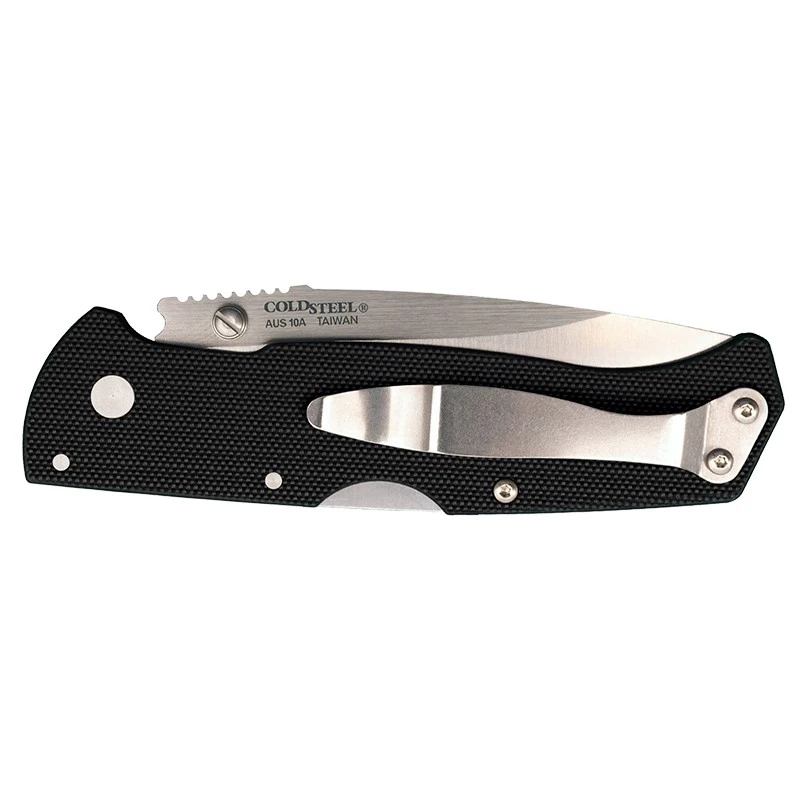 Le Air Lite Drop Point est un couteau EDC pour les utilisateurs exigeants, que ce soit en terme de performances ou de transport. Ce modĂšle CS26WD est en toute logique dotĂ© d’une lame drop point mesurant 89mm de longueur, en acier AUS10A. Ă l’avant, on observe le nom du couteau, Ă savoir Air Lite, au dos, le nom de la marque ou encore le type d’acier. On peut le dire, la qualitĂ© est au rendez-vous, comme d’habitude avec la marque AmĂ©ricaine Cold Steel ! Ă titre informatif, le systĂšme de verrouillage utilisĂ© est le tri-ad lock ayant l’avantage d’ĂȘtre trĂšs sĂ©curisant, notamment pour les doigts. Le couteau Cold Steel Air Lite Drop Point possĂšde un manche noir en G10 habillĂ© d’un clip de poche rĂ©versible au dos dans l’optique de simplifier les dĂ©placements et mouvements avec le couteau. Qui plus est, le confort d’utilisation est de mise, merci Cold Steel !