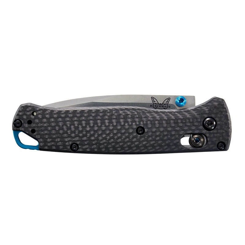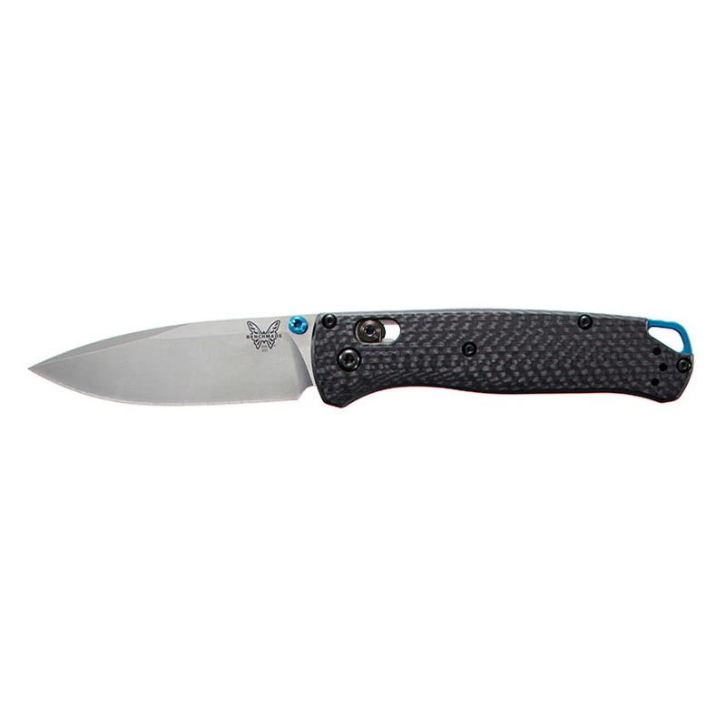 Le Benchmade Bugout est clairement le couteau de poche EDC par excellence, que l’on peut aisĂ©ment transporter d’un bout Ă l’autre. Ce modĂšle 535_3 va vous laisser de marbre, il faut dire qu’il est Ă la fois performant et Ă©lĂ©gant, tout ce qu’on demande Ă un couteau pliant ! Ce Bugout est dotĂ© d’une lame de 82mm, profil drop point, conçue en acier CPM-S90V de grande qualitĂ©. Une lame satinĂ©e qui est marquĂ©e par le logo papillon Benchmade situĂ© juste Ă cĂŽtĂ© du double thumb stud au coloris bleu Ă©tincelant pour la note moderne. Ce couteau Benchmade Bugout 535_3 intĂšgre une poignĂ©e fraisĂ©e en fibre de carbone, elle comporte un clip rĂ©versible afin de faciliter le transport au quotidien. Le backspacer bleu permet lui aussi de simplifier les dĂ©placements quotidiens. FabriquĂ© aux Etats-Unis, ce modĂšle 535_3 est un must pour les utilisations quotidiennes. N’oubliez pas la personnalisation par gravure en supplĂ©ment !