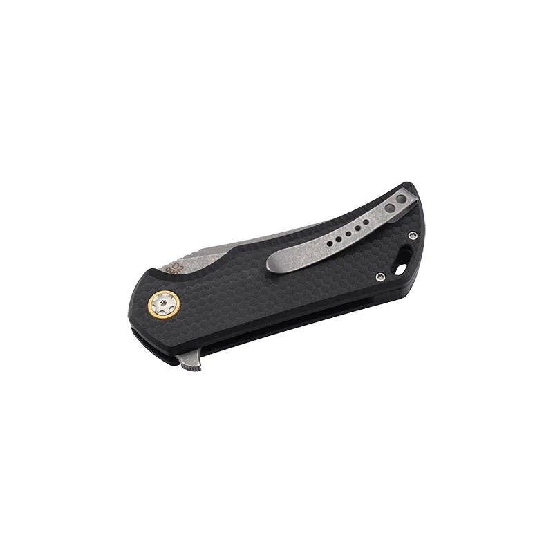 Le manche du couteau Böker Plus Golem est conçu en G10 noir avec une belle texturation façon nid d’abeille. Le repose-pouce comprend des rainures sur le pourtour, il garantit une grande sécurité durant le travail. Un anneau décoratif en laiton apporte une touche de couleur à l’ensemble. Le trou de lanière ainsi que le clip de transport font qu’il est aisé d’emporter le couteau au quotidien. Le Golem Böker Plus vous sera livré avec sa pochette en nylon.