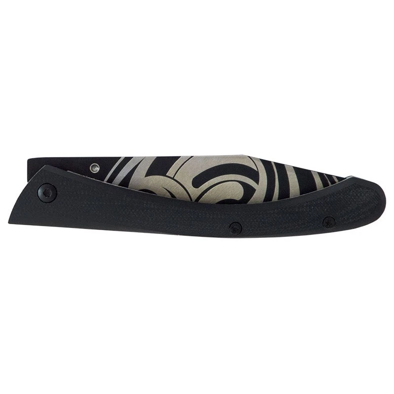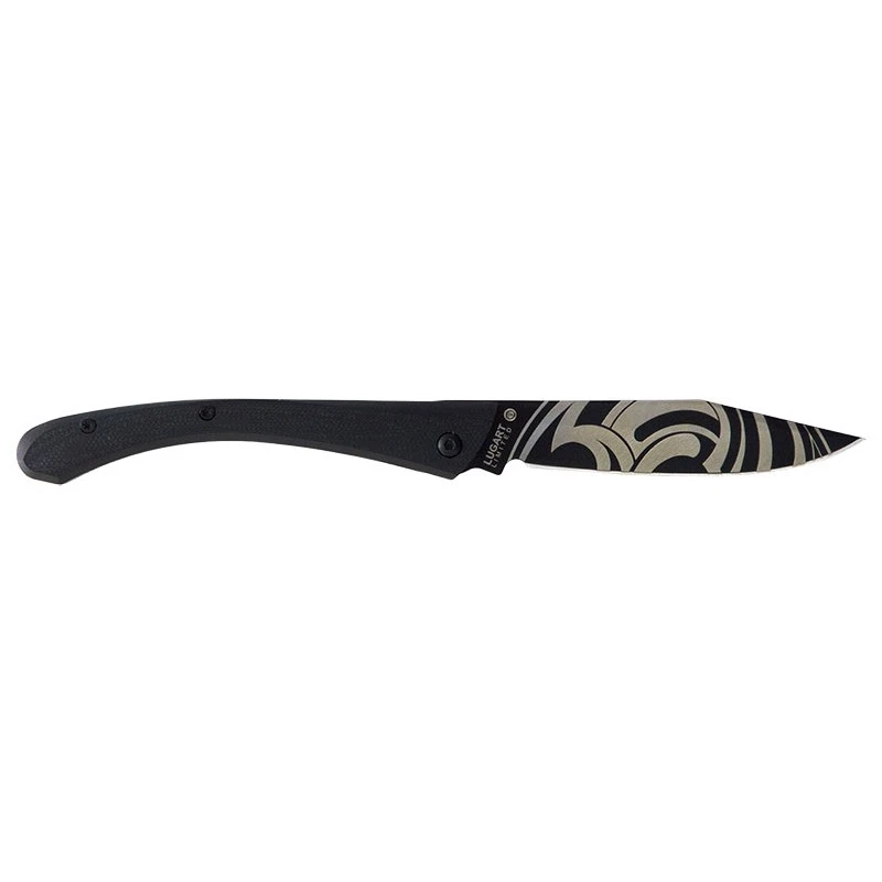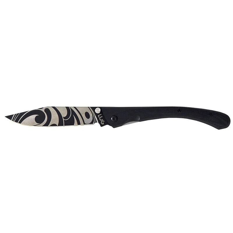 DesignĂ© et assemblĂ© en France par LUG, ce couteau C63 Tattoo LUGART possĂšde un manche en acier inoxydable et G10 noir usinĂ© de façon remarquable. Sa forme est particuliĂšrement harmonieuse, son ergonomie est Ă©galement excellente. Sa longueur de 115mm couplĂ©e Ă un poids plume de 80 grammes font que ce couteau se transportera sans encombre au quotidien. D’autres motifs sont disponibles pour la collection LUGART Limited.