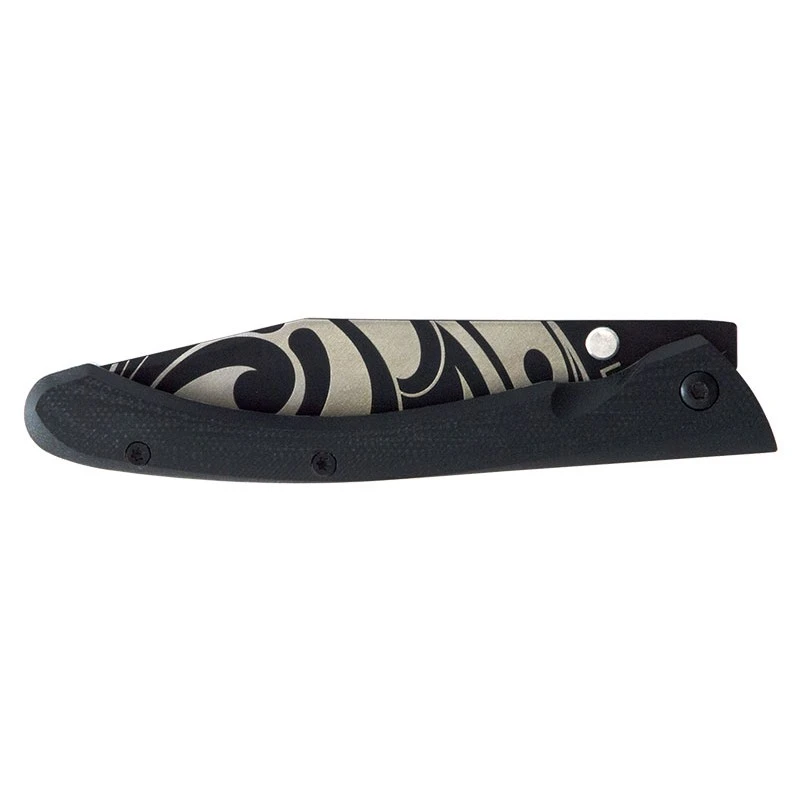 SĂ©rie LUGART Limited oblige, ce couteau C63 Tattoo est pourvu d’une lame tatouĂ©e au laser par des motifs abstraits aux coloris fortement contrastĂ©s. Nul doute que vous apprĂ©cierez cet esthĂ©tique particuliĂšrement travaillĂ© qui est en quelque sorte la marque de fabrique de la coutellerie LUG. Nous attirons votre attention sur le fait que la lame est fabriquĂ©e en acier inoxydable 7Cr17MoV (0.7% carbone-17% chrome, molybdĂšne-vanadium) avec revĂȘtement titane noir PVD. Sans oublier de prĂ©ciser la prĂ©sence d’un thumb stud pour faciliter son dĂ©ploiement au quotidien : verrouillage via le mĂ©canisme frame lock.