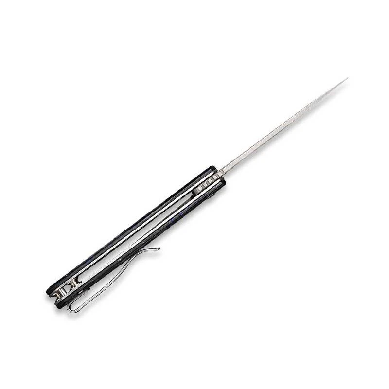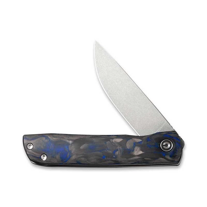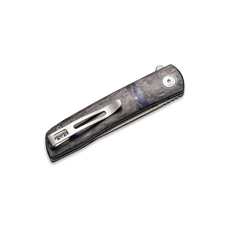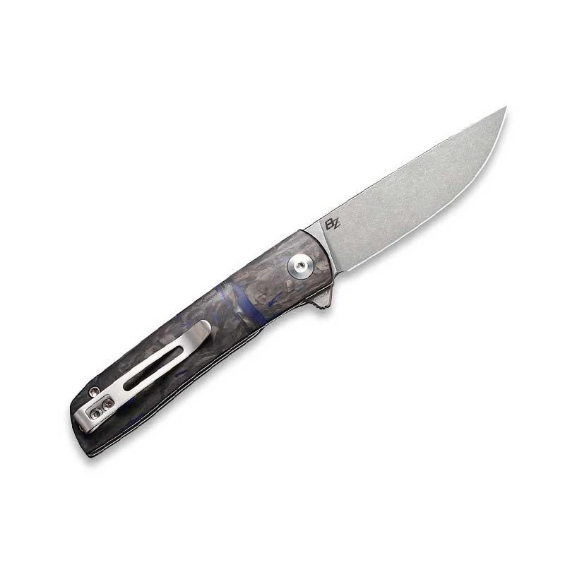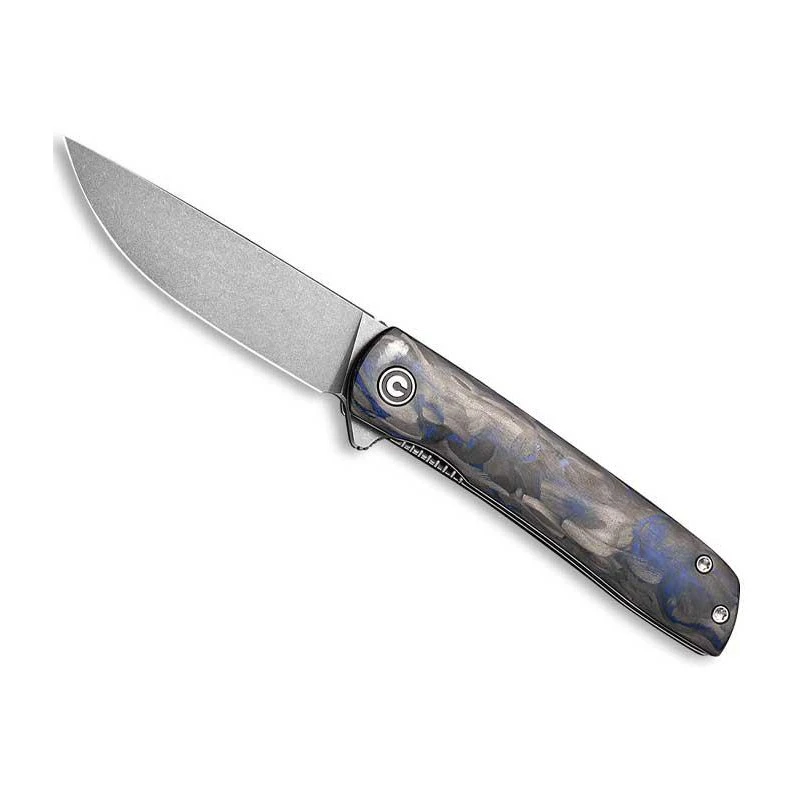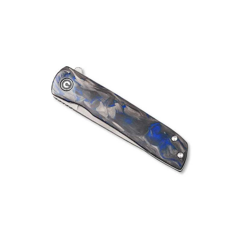 Ce couteau Civivi BO C20009BA ne laissera personne indifférent par son manche particulièrement attrayant. Il se compose d’une base en acier inoxydable enrichie de plaquettes en fibre de carbone. Ces dernières sont très esthétiques, elles comportent un mélange de bleu, de noir et d’autres nuances sombres pour un résultat harmonieux. Autant dire que vous n’allez pas vous lasser de regarder le manche, ni de le prendre en main ! En raison de la longueur de 95mm en position fermée et grâce au clip, la facilité de transport est réelle.