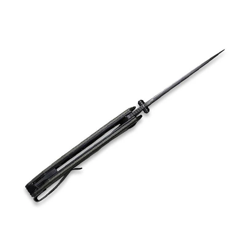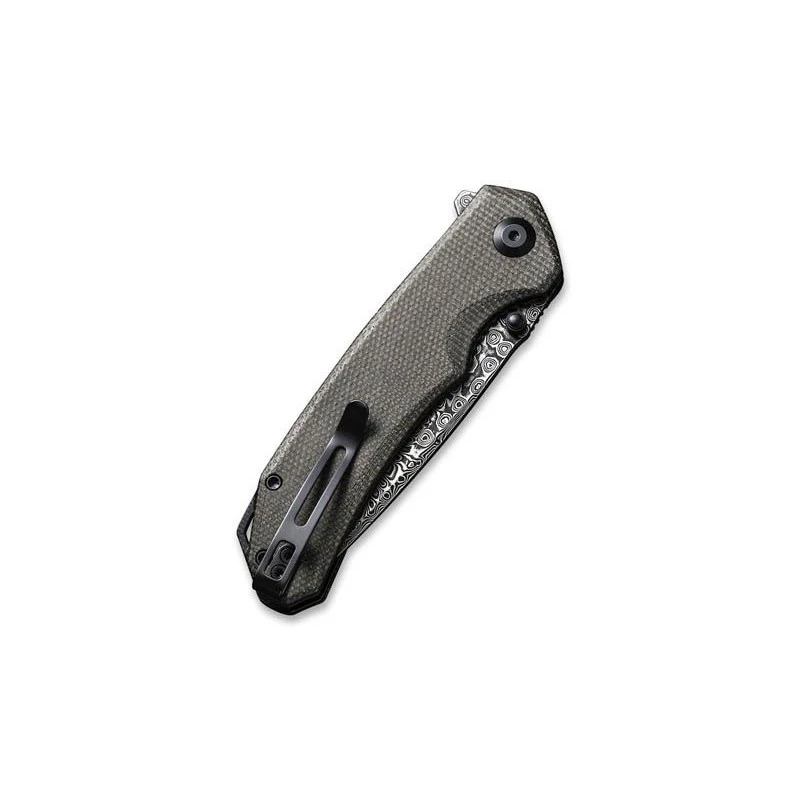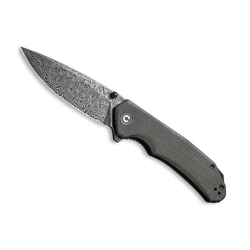 Le Civivi Brazen C2102DS3 se dote d’une lame en acier damas industriel à la pointe fortement prononcée. On précisera le fait que l’acier damas se caractérise par la présence de nombreux motifs sur la lame, lui conférant ainsi une note des plus élégantes. Afin d’être déployée facilement, la lame intègre un flipper ainsi qu’un double thumb stud, le mécanisme ball bearing permet lui de fluidifier ou encore rendre plus douce les ouvertures. Ce couteau pliant Civivi Brazen C2102DS3 est pourvu d’un manche mesurant 115mm en acier inoxydable noir, surmonté de plaquettes en micarta coloris vert foncé (matériau à base de papier mélangé avec de la résine). Design, il tient bien en main et assure une facilité de transport à chaque instant via le clip noir au dos. Le logo Civivi est également présent sur le manche ce qui fera plaisir aux fans. Couteau livré avec sa pochette de rangement en nylon noir.