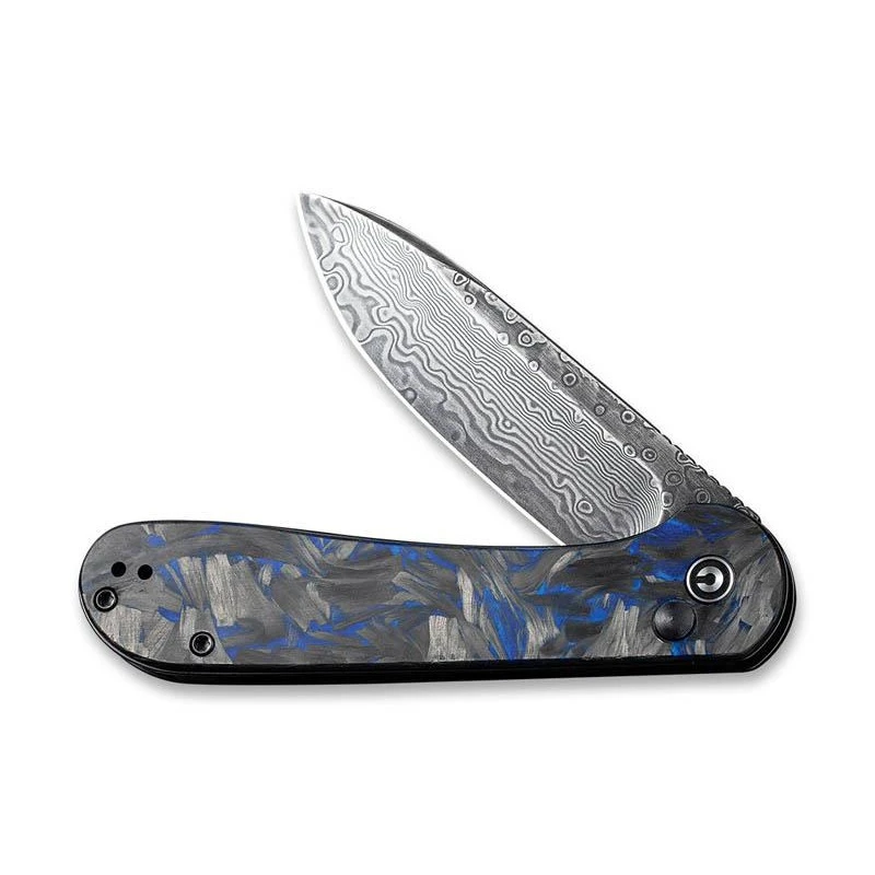 Le Civivi Button Lock Elementum doit son nom du fait que pour verrouiller/déverrouiller la lame, il faudra appuyer sur le bouton situé sur le manche, juste à côté du logo Civivi d’ailleurs. Ce modèle C2103DS1 est pourvu du mécanisme ball bearing pour des ouvertures toujours très fluides. Ce couteau Civivi Button Lock Elementum est une véritable œuvre d’art : son manche en acier inox noir comprend des plaquettes en fibre de carbone coloris noir/bleu. De longueur 115mm, il est particulièrement élégant, sophistiqué, il se transporte facilement grâce au clip de poche noir au dos. La pochette en nylon noir, fournie en plus du couteau, vous permettra de le protéger lors des déplacements et mouvements. Ce Civivi Button Lock Elementum, modèle C2103DS1, est muni d’une lame en acier damas industriel mesurant 88mm de long (dureté HRC de 58-60). Son tranchant ne manquera pas de vous impressionner, tout comme sa forte élégance !