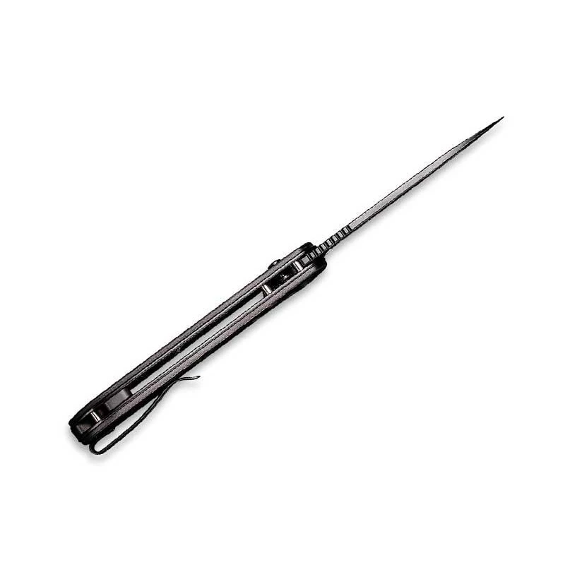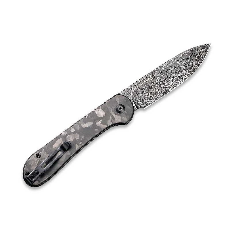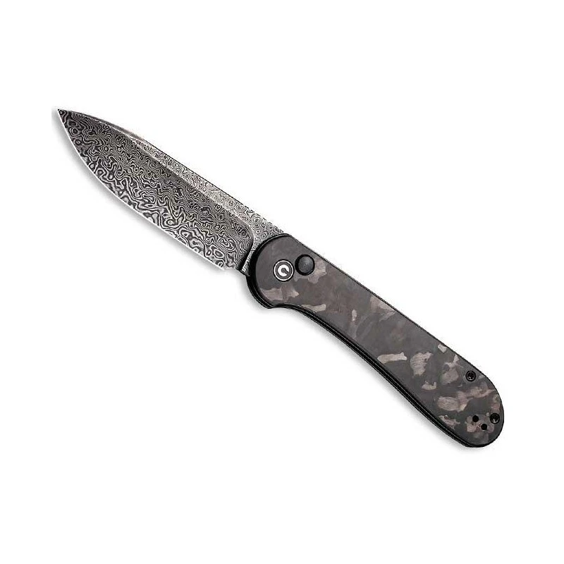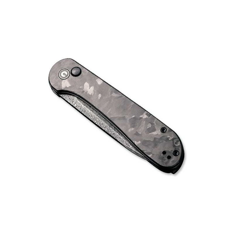 Ce modèle C2103DS3 est une version originale et attrayante du célèbre couteau Civivi Button Lock Elementum. Elle est caractérisée par un manche mesurant 115mm de longueur, en acier inoxydable noir avec plaquettes en fibre de carbone marbrée pour un visuel à couper le souffle ! Certain(e)s pourront y voir une sorte de décoration camouflage très en vogue ces derniers temps. Le clou du spectacle reste bien sûr l’indémodable lame de 88mm en acier damas, que l’utilisateur peut ouvrir en douceur via le mécanisme ball bearing. Une lame particulièrement esthétique, d’épaisseur 3mm (dureté HRC 58-60), qui se déploie grâce au bouton de couleur sombre situé juste à côté du logo contenant la lettre C pour « Civivi » bien sûr. Un bouton qui sert au verrouillage mais aussi au déverrouillage de la lame damas. Ce couteau pliant Civivi Button Lock Elementum C2103DS3 est livré dans une pochette en nylon de couleur noire.