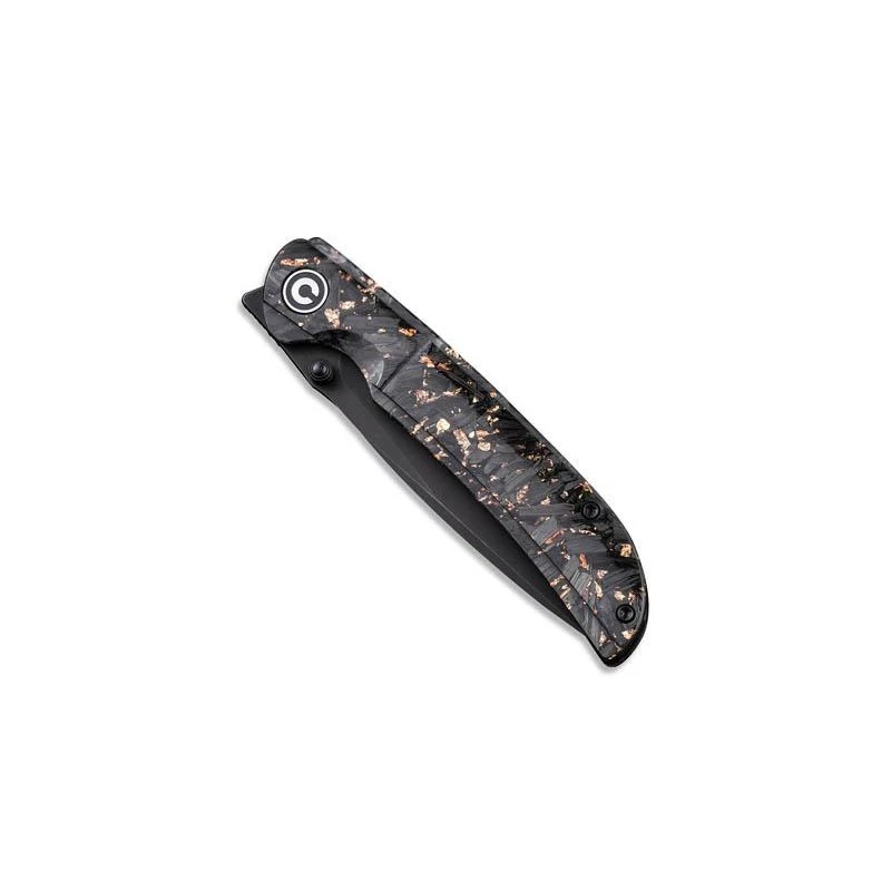 Ce couteau Civivi C2106C, modèle Imperium, dispose d’une lame noire blackwash en acier Nitro-V, mesurant à peu de chose près 88mm de longueur. Comme toujours l’ergonomie est de mise si bien que la lame s’ouvre facilement grâce au bouton double et le front flipper, et de façon très fluide via le mécanisme ball bearing. N’ayez crainte, elle sera parfaitement verrouillée via le mécanisme liner lock, un grand classique en coutellerie. Mais toute la subtilité du Civivi Imperium C2106C réside dans son manche de 11cm de long. Fait de résine, il comprend de belles inclusions d’éclats de fibre de carbone et de cuivre, ce dernier apportant des nuances colorées par dessus un ensemble plus sombre. Le manche est très attrayant visuellement parlant, il comprend aussi le logo Civivi ce qui fera plaisir aux nombreux fans. Côté transport, aucun problème grâce à la présence d’un clip au verso.