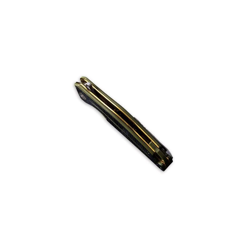 Le couteau Civivi Statera référence C901B dont le manche en acier inoxydable doré est cette fois-ci habillé de plaquettes en G10 vert avec inserts en fibre de carbone noir. On peut dire qu’il est hyper élégant et toujours autant facile à transporter grâce au clip noir en titanium. De toute façon, il faut savoir que le manche ne mesure que 12cm ce qui assure un transport toujours très facile en glissant simplement le couteau dans la poche. Tous les déplacements sont vraiment aisés, même avec le couteau Civivi Statera vert/noir, il faut dire qu’il ne pèse qu’à peine plus de 100 grammes.