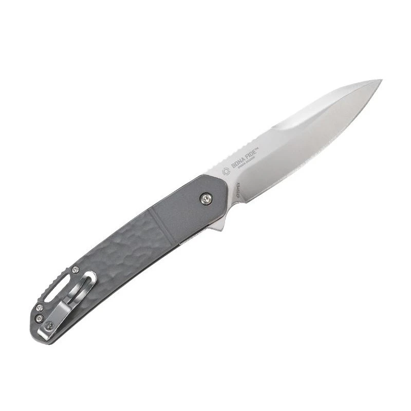 Le couteau Bona Fide, par CRKT, est également muni d’un manche de couleur gris, en aluminium, qui combine résistance et légèreté, deux enjeux cruciaux en matière de couteaux. L’avantage de ce modèle K540GXP.CR, c’est qu’il est entièrement démontable/remontable pour une facilité de nettoyage en toutes circonstances (technologie FIELD STRIP GEN II). Petit clip en inox au dos. Existe aussi en coloris vert.