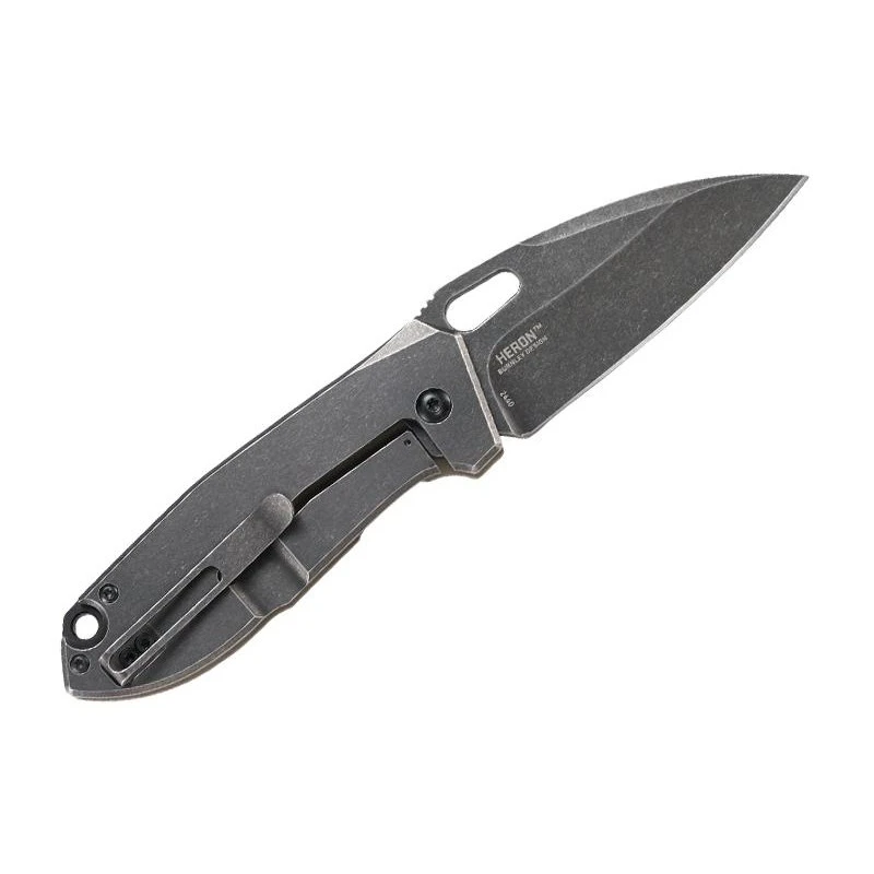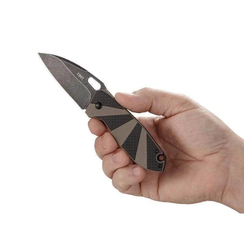 Il porte le nom d’un oiseau, c’est le CRKT Heron ! Ce couteau de poche est conçu par le célèbre designer Lucas Burnley d’Oregon. La première chose que l’on remarque, c’est son manche en G10 beige avec inserts en fibre de carbone au recto. Il s’agit de grosses rayures avec à chaque fois une alternance de couleurs, cela peut par exemple faire penser aux rayons du soleil, à la nature, chacun est libre d’interpréter cela comme il le désire. Au verso, la poignée est fabriquée en acier inoxydable, il y a aussi un clip de poche ainsi qu’un passe-lacet afin de rendre la transportabilité excellente. Le couteau pliant CRKT Heron est doté d’une lame à trou de 74mm de longueur, fabriquée en acier 8Cr14MoV, elle est de type wharncliffe. La finition est de type stonewashed ce qui permet à la lame de bien vieillir, mais aussi de masquer les rayures du quotidien. Fente pour le pouce afin de pouvoir ouvrir la lame à une main.