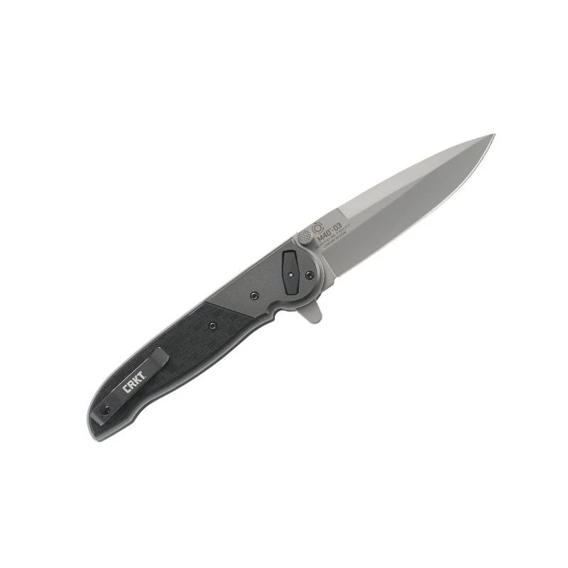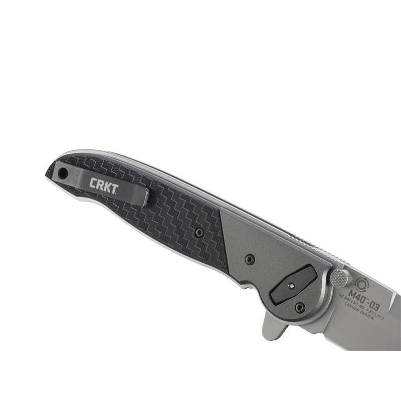 Le CRKT M40-03 de Kit Carson est un couteau qui cette fois-ci, se dote d’une lame en acier 1.4116 à la finition satinée, et surtout de forme spear point pour un aspect toujours plus percutant, agressif. Puissante, elle peut être rapidement ouverte via le flipper ainsi que le double thumb stud, pour agir vite et bien, avec puissance ! Le blocage de la lame spear point est assuré par le système Deadbolt, lame marquée par l’inscription CRKT et personnalisable par gravure. Le CRKT M40-03 est un couteau de poche fiable, muni d’une forte résistance grâce à son manche conçu en nylon et fibre de verre avec mitre en aluminium 6063. Le système IKBS garantit des ouvertures de lame toujours très douces et fluides, le clip de poche au verso de la poignée assure lui de pouvoir facilement transporter le couteau d’un bout à l’autre. Longueur en position fermée : 115mm. Un bel hommage à Kit Carson !