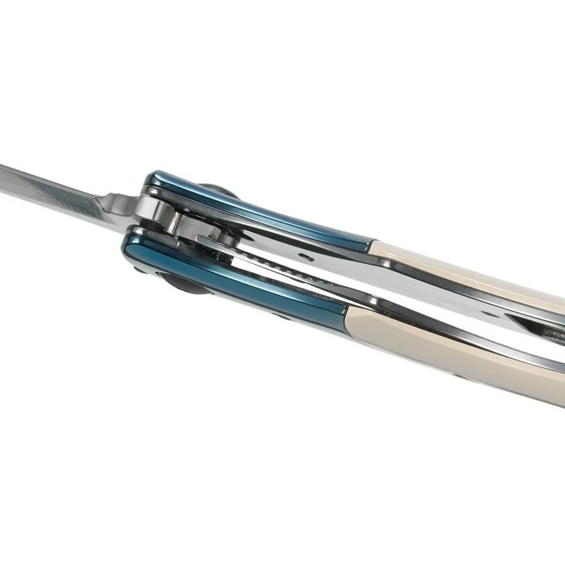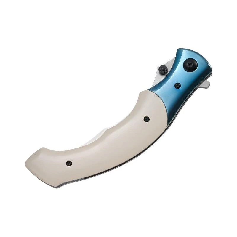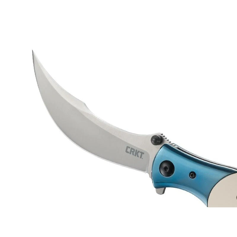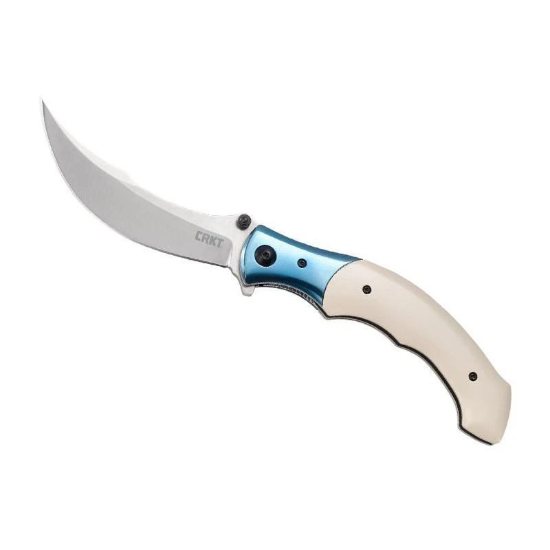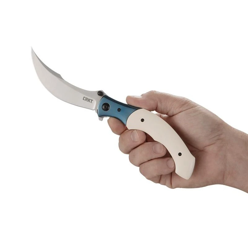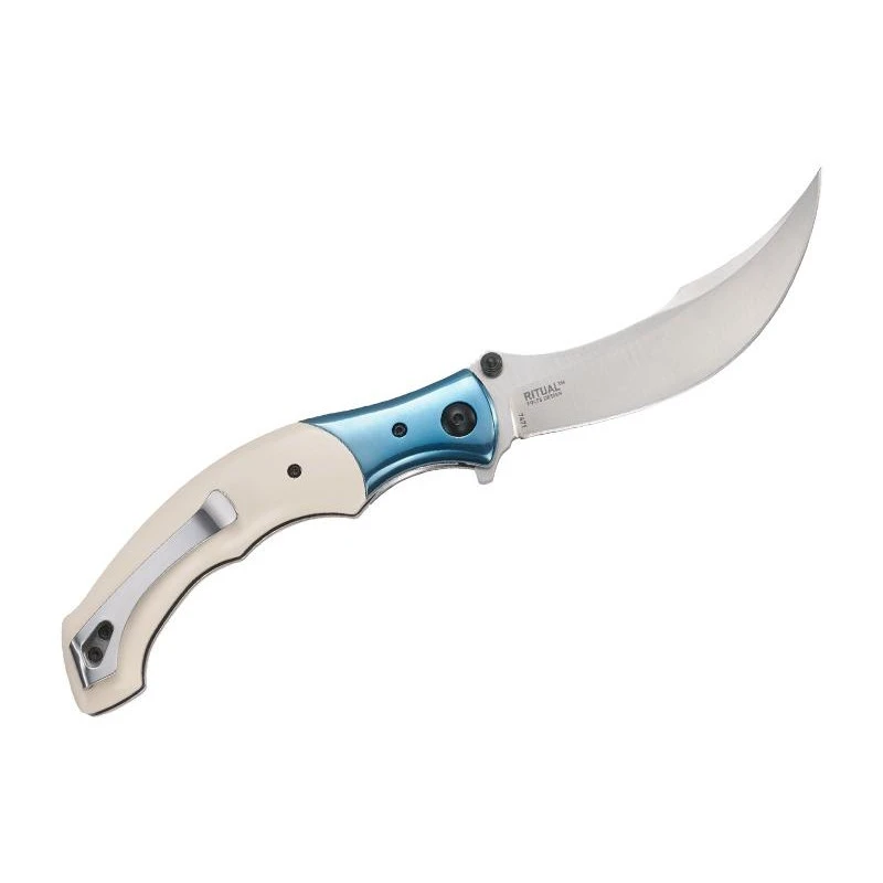 Une fois que vous aurez vu le couteau CRKT Ritual de Alan Folts, vous n’êtes pas prêt de l’oublier de si tôt ! Il faut dire que son design est très atypique ou encore original. Sa lame est fabriquée en acier inoxydable 12C27, finition satinée, elle est de forme courbée, et de plus en plus fine au fur et à mesure que l’on se rapproche de la pointe. Avec double thumb stud, système d’ouverture assistée, verrouillage liner lock ainsi que système IKBS. Le CRKT Ritual 7471.CR est un couteau pliant qui possède aussi un manche sortant de l’ordinaire, avec une fabrication en micarta ivoire, il y a aussi une mitre en acier inox bleu qui apporte une note colorée, chaleureuse. Ce manche mesure 14cm de longueur et intègre au dos un clip de poche coloris gris, tout cela dans l’optique de permettre à l’utilisateur de le transporter facilement, sans encombre. Avec le couteau CRKT Ritual, vous aurez à vos côtés un objet tranchant qui ne passera jamais inaperçu !