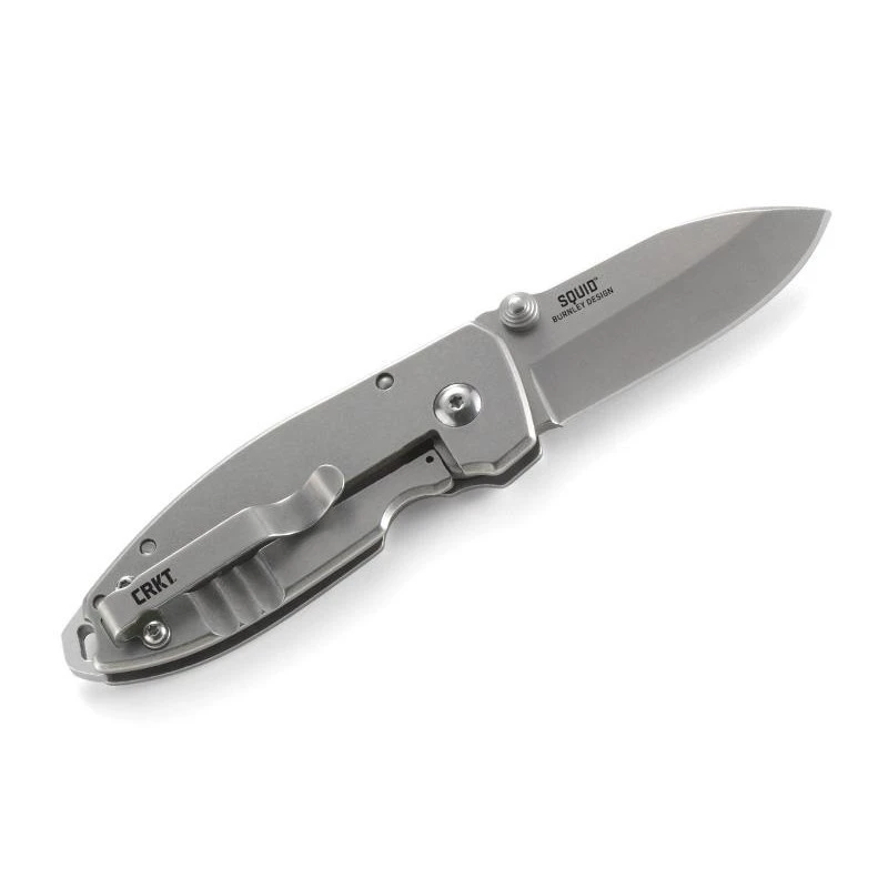 Le Squid CRKT de Lucas Burnley modèle 2490 est un couteau pliant de petite taille avec lequel vous allez pouvoir accomplir de grandes choses. Avant de commencer à le décrire, sachez qu’il existe en de multiples variantes, nous sommes ici en présence de la version gris stonewashed, une finition délavée parfaite pour le masquage des rayures. Le CRKT Squid 2490.CR est doté d’une lame en acier 8Cr13MoV à bouton double ce qui permet de la déployer plus facilement, le verrouillage est réalisé efficacement par le frame lock. De style drop point, la lame mesure 54mm de long, de petite taille, elle vous sera d’une grande utilité au quotidien. Le logo CRKT est présent à côté du double thumb stud, ce qui ne manquera pas de ravir les fans de CRKT, Columbia River Knife & Tool. Manche de 85mm en acier inoxydable avec trou pour lacet, porte-clés, situé en bout de poignée, ainsi qu’un clip de poche au verso.