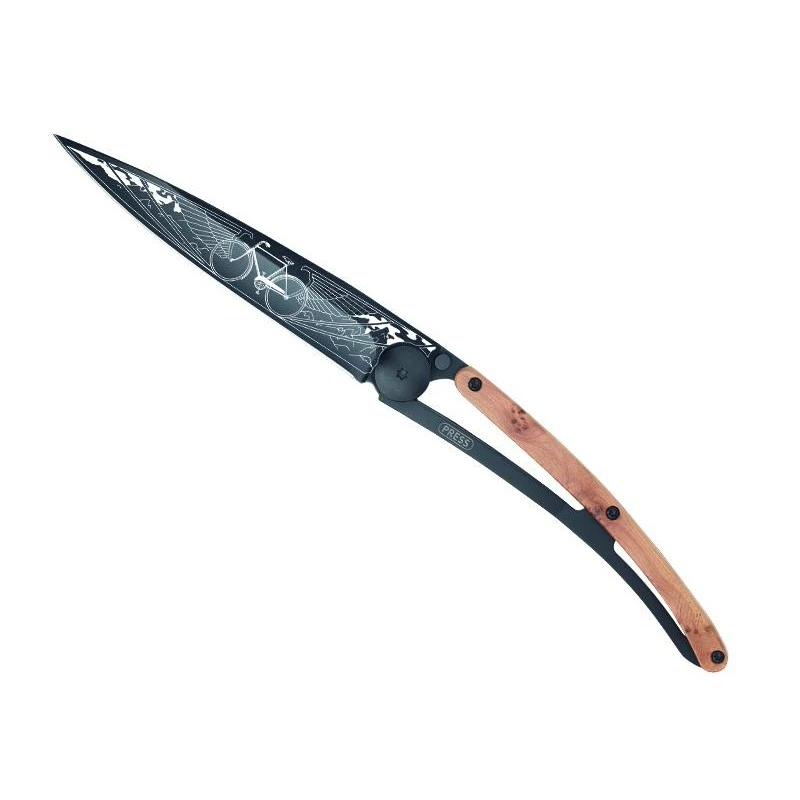 Incroyable de légèreté, ce couteau Deejo TATTOO ne pèse que 37g ce qui ne l’empêche pas d’être efficace bien au contraire. Il est doté d’une lame en acier inoxydable 420 finition titane noire de 9.5 cm de longueur avec cran de sécurité « Liner lock« . Très originale, la lame est décorée d’un sublime motif vélo à ailes qui ne laissera pas indifférent les amateurs de cyclisme et autres sportifs fans de deux roues. Deejo oblige, on retrouve sur ce couteau TATTOO un manche squelette de 11 cm de longueur orné d’une plaquette en loupe de genévrier. Pratique, le clip de ceinture permet de toujours avoir le couteau à disposition.