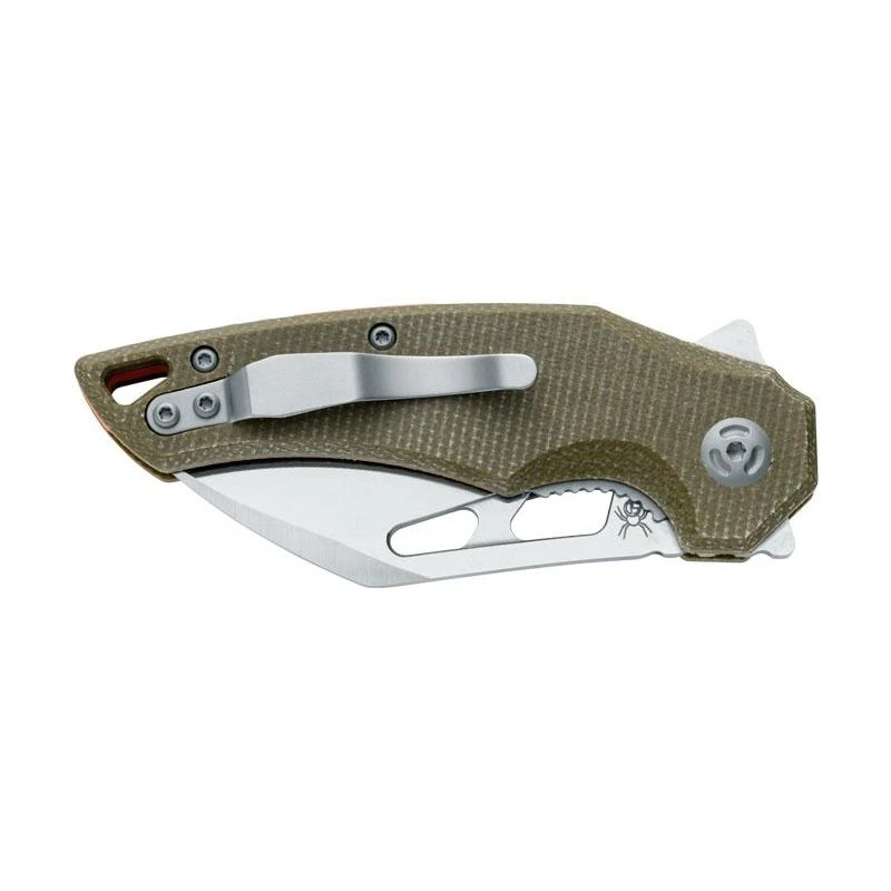 Le manche du couteau est fait d’un matériau de haute qualité : le Canvas Micarta vert OD, qui offre une excellente prise en main et une résistance à l’usure à long terme. L’entretoise G10 orange ajoute une touche de couleur vive et offre une structure solide pour le couteau. Le clip en acier inoxydable 420J2B permet une fixation facile et sûre du couteau à la poche ou à la ceinture.
