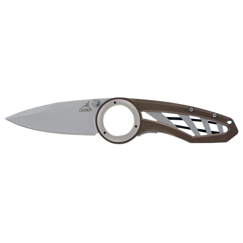 ĂquipĂ© d’une grosse bague circulaire au niveau du manche, le couteau Gerber Remix est trĂšs surprenant, ou intrigant si vous prĂ©fĂ©rez. Originale, elle est aussi trĂšs utile puisqu’elle apporte de la stabilitĂ© supplĂ©mentaire en utilisation. Plein de surprises, le manche est fabriquĂ© en aluminium anodisĂ© coloris marron/gris, avec ajour et bel effet dĂ©structurĂ©. Toujours trĂšs confortable Ă manipuler, la poignĂ©e mesure un peu plus de 11cm de long, avec clip au dos pour le transport.