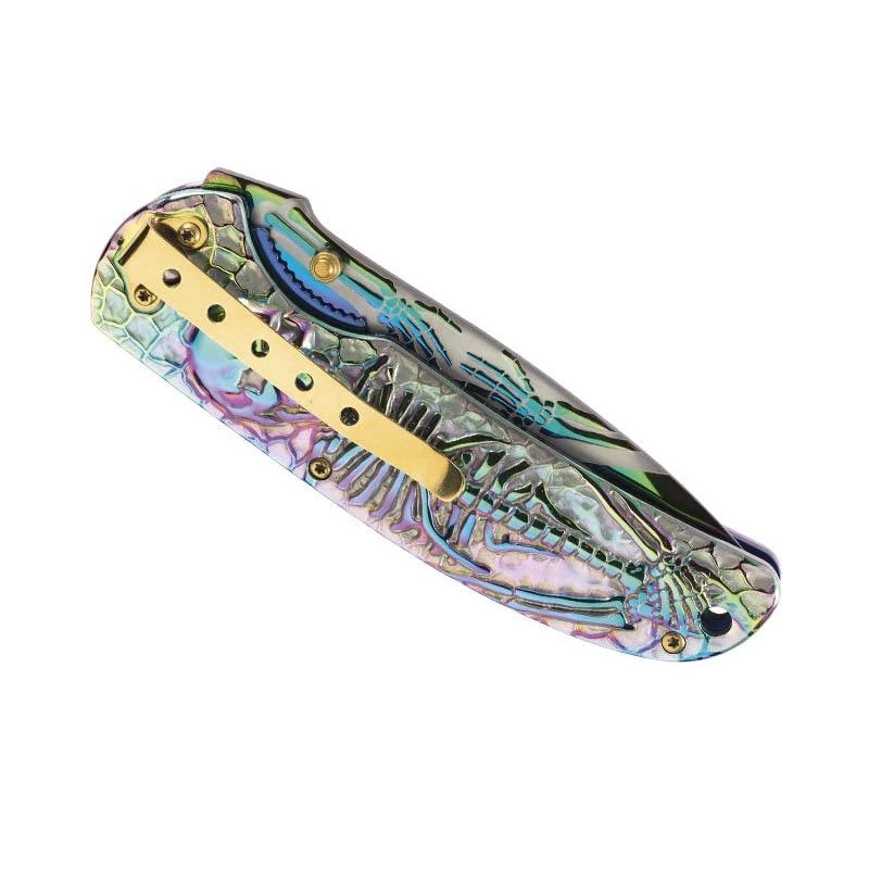 Voilà un couteau pliant Herbertz extrêmement original qui va plaire à toutes les personnes aimant les couteaux atypiques. Il possède un manche en acier inoxydable décoré par un motif squelette arc-en-ciel : mieux vaut ne pas avoir peur pour l’utiliser ! Le manche intègre un clip de poche permettant de pouvoir transporter le couteau Herbertz 578612 avec toujours plus de facilité au quotidien. De toute manière, le manche mesure 12cm de long et pourra donc aisément rejoindre le sac à dos ou une petite poche de vêtement.