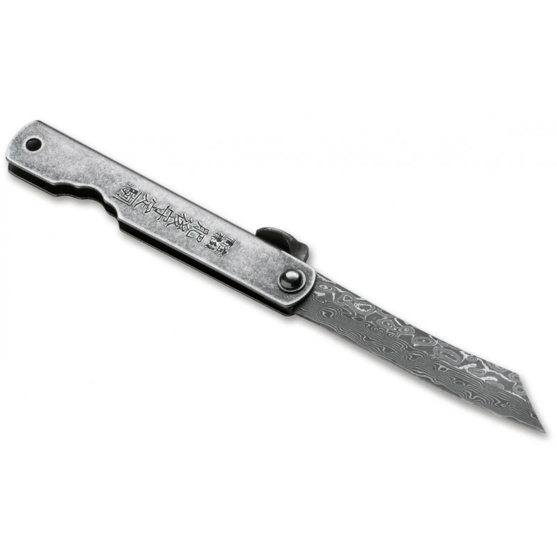 Ce couteau pliant Higonokami Kinzoku Damascus Böker possède un manche coloris argent fabriqué en acier inoxydable, toujours décoré bien sûr par les incontournables symboles Japonais. Résistant à la rouille/corrosion, le manche comporte en bout un trou pour lanière, il est également ajouré d’un trou sur le côté pour une prise en main en permanence confortable. Avec une longueur de 9cm et une très grande légèreté (poids de 37g), le Kinzoku Damascus Higonokami, par Böker, n’aura aucune difficulté à être transporté au quotidien. Un couteau de poche qui allie un style élégant/vintage à d’excellentes performances!