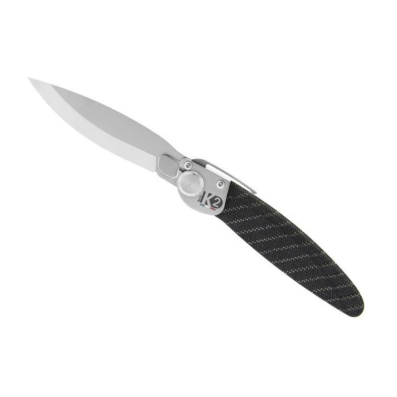 Ce couteau K2.13M possède aussi une lame en acier Z40C13 microbillé, elle est équipée du système de verrouillage K-lock. Une lame dont la forme est très esthétique, qui est à personnaliser par procédé gravure. Fabriqué en France, ce couteau pliant K2 vous sera livré avec un étui suédine ainsi qu’une pochette cadeau, parfait pour offrir ou se faire plaisir ! Avec clip.