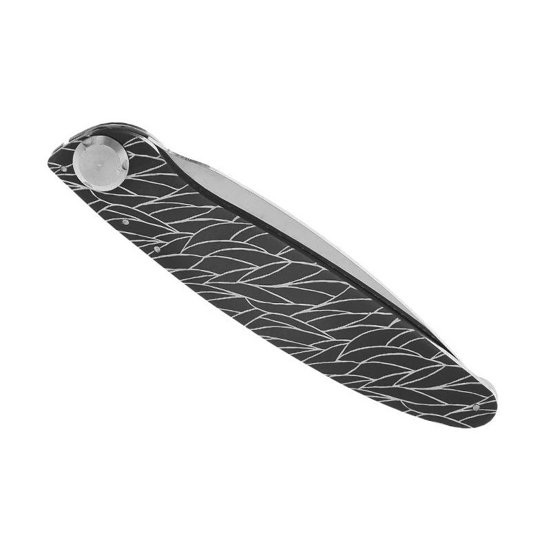 C’est peut être parce qu’il est très léger que ce couteau pliant K2 est pourvu d’un manche en acier inox avec décorations plumes. Un joli manche sombre en acier où l’on peut apercevoir des lignes blanches formant des plumes similaires à celles des oiseaux. Pour « casser » le côté sombre du manche, ce dernier intègre un bel habillage en bois olivier, un bois relativement clair. Longueur totale du manche : 115mm, offrant ainsi une facilité de transport quotidienne. Le couteau K2.01 décor plumes se glisse ainsi très facilement dans la poche ou dans une sacoche.
