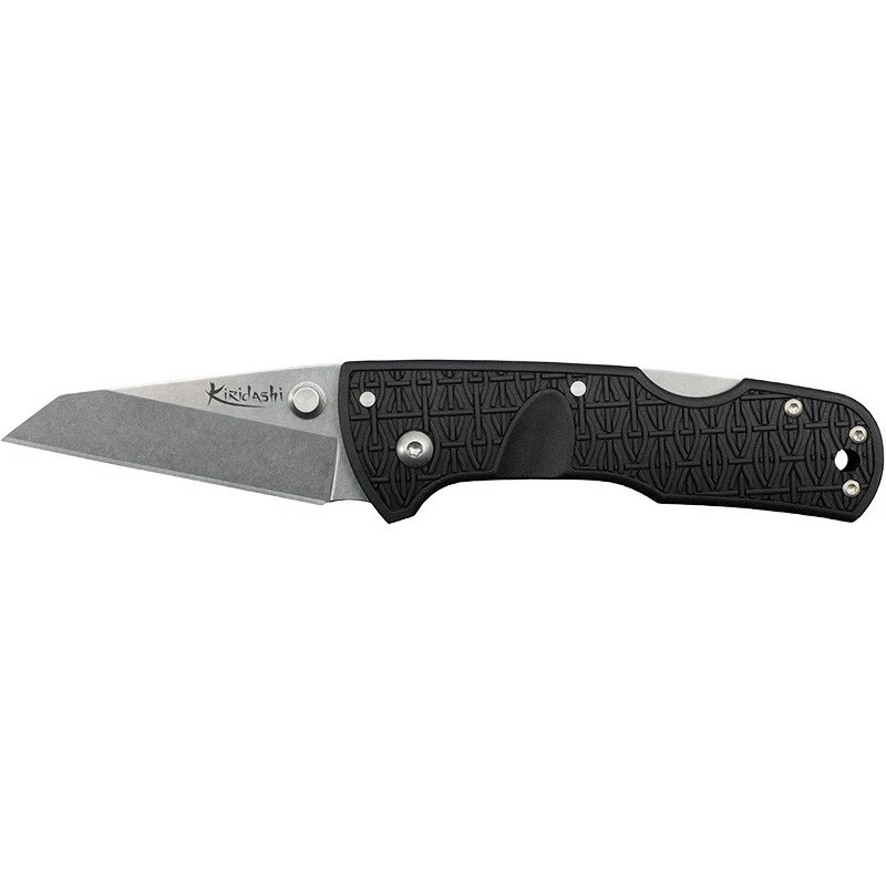 Le Kiridashi est un couteau traditionnel Japonais, utilisĂ© par pratiquement tout le monde au pays du soleil levant. Il est utilisĂ© pour toutes les tĂąches de coupe, une grande polyvalence qui sĂ©duit un public toujours plus large. Le fabricant Cold Steel a conçu la version pliante du couteau Kiridashi, en intĂ©grant une lame de 63mm de longueur en acier inoxydable 4034SS. La lame intĂšgre un double thumb stud (bouton de pouce) avec juste Ă cĂŽtĂ© la prĂ©sence de l’inscription Kiridashi. N’hĂ©sitez pas Ă ajouter un texte via le bouton ajouter une gravure que vous trouverez plus bas. La poignĂ©e est de couleur noire, elle est fabriquĂ©e en griv-ex, un matĂ©riau plastique fortement renforcĂ© par de la fibre de verre afin d’apporter de la soliditĂ©. Elle est dĂ©corĂ©e par des motifs rappelant le style Asiatique, Japonais. Le Cold Steel Kiridashi est un couteau facile Ă clipser dans la poche grĂące au clip rĂ©versible, il vous accompagnera partout, sans exception, et sans difficultĂ© ! Longueur totale : 165mm.