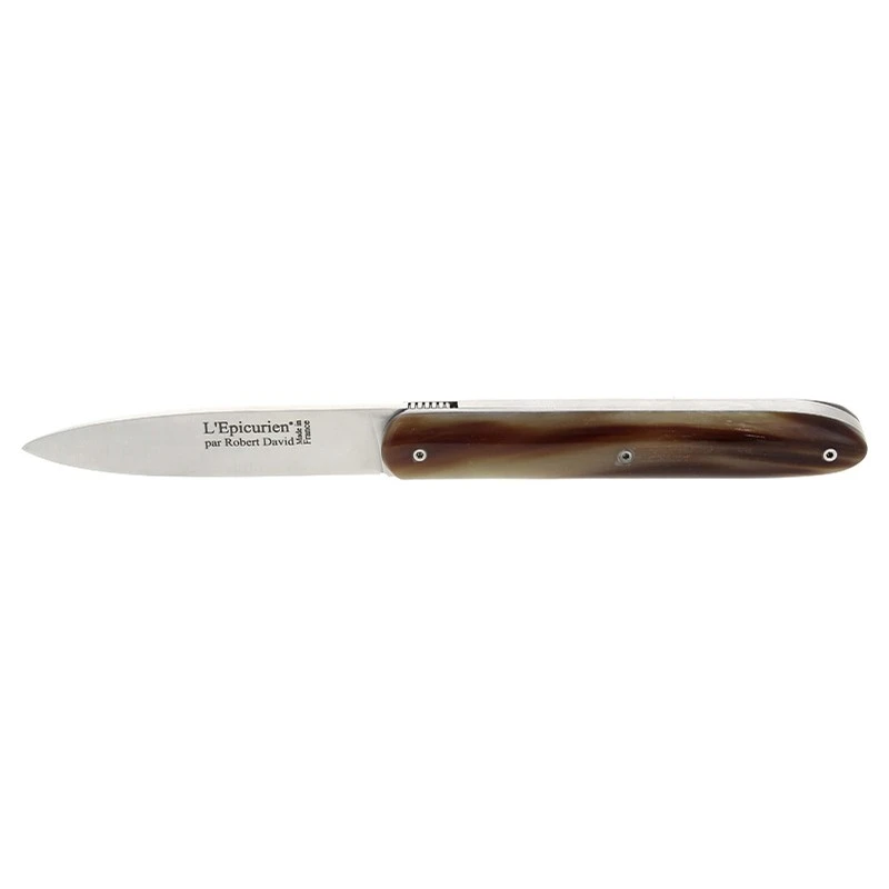 Le couteau de poche L’épicurien est une création de l’artisan coutelier Robert David, il est conçu et fabriqué dans les ateliers de la coutellerie, dans le bassin Thiernois. Ce modèle DESB0113PC rencontre un franc succès grâce à sa forme sobre et élégante, mais surtout pour son splendide manche en corne blonde, agréable à tenir en main qui plus est. Un matériau d’origine animale au design particulièrement attrayant : vous allez l’adorer, c’est une certitude ! La poignée en corne blonde permet également de transporter le couteau avec aisance, en raison de son faible gabarit. Ainsi ce couteau Robert David L’épicurien sera en mesure de vous accompagner lors de vos activités quotidiennes, pour que vous puissiez profiter des plaisirs simples de la vie ! Côté lame, elle mesure 9cm de longueur, et se voit décorée par le texte L’épicurien par Robert David, elle est fabriquée en acier inoxydable 12C27 Sandvik, gage de tranchant, mais aussi de résistance (notamment à la corrosion). Possibilité de la personnaliser sur la face arrière. Verrouillage type liner lock.