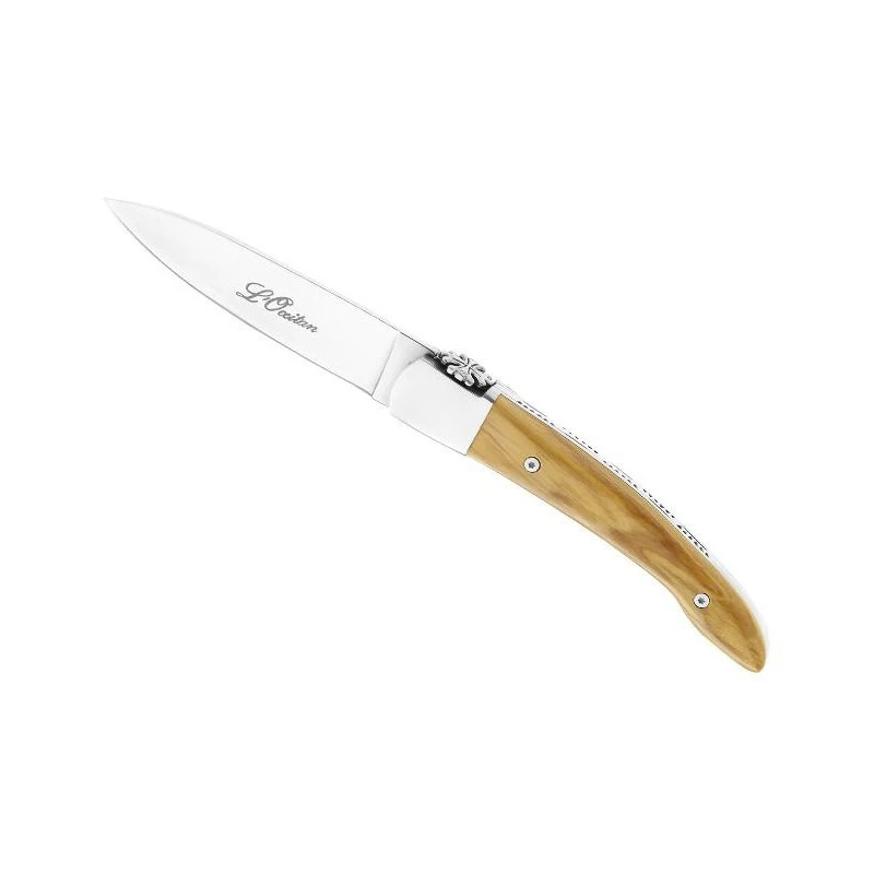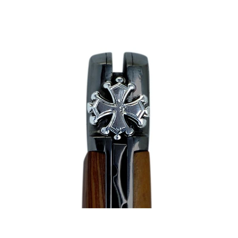 L’occitan est une langue romane qui est parlée dans 33 départements du Sud de la France (régions Aquitaine, Midi-Pyrénées, Languedoc-Roussillon, Provence-Alpes-Côte-D’Azur, Auvergne, Limousin, Poitou-Charentes et Rhône-Alpes). Ce couteau pliant L’occitan, référence 1454, est doté d’une lame conçue en acier inoxydable Z100 assurant le tranchant ainsi que la résistance à la corrosion. Cette même lame est marquée par l’inscription L’Occitan, possibilité de gravure au dos en supplément (texte au choix). Le couteau possède un manche en bois olivier, avec ressort guilloché et croix occitane, le symbole de l’Occitanie. Le manche de 11cm est plus fin en bout ce qui permet de le saisir plus facilement tout en apportant plus de style. Mitre en acier inoxydable mat au centre.