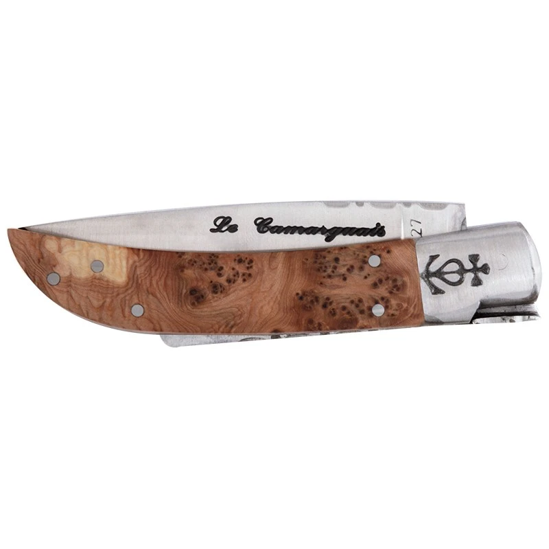 Le made in France une nouvelle fois à l’honneur sur le-couteau.com avec ce couteau Le Camarguais n° 10 trident forgé, référence CA20089. Un couteau pliant de fabrication artisanale 100% Française, mettant la Camargue à l’honneur, qui est muni d’un joli manche en bois genévrier mesurant 105mm de long. Un beau manche naturel, qui est aussi légèrement courbé pour une meilleure prise en main. Comme d’habitude chez le Camarguais, on retrouve au niveau de la mitre le décor croix Camarguaise qui est en quelque sorte l’emblème de la région. Le modèle le Camarguais n° 10 trident forgé genévrier est un couteau de poche, dans la mesure où il se transporte avec énormément de facilité au quotidien. La preuve ultime, c’est qu’il se loge aisément dans la poche ! La lame est conçue en acier inoxydable 12C27, profil drop point, avec ouverture type back lock, longueur 9cm. Une lame à bout pointu qui est déjà marquée par l’inscription « Le Camarguais » avec écriture grasse, possibilité de la personnaliser par vos propres textes. Un couteau régional Français qui met la Camargue sur le devant de la scène ! Lame et ressort guillochés main.