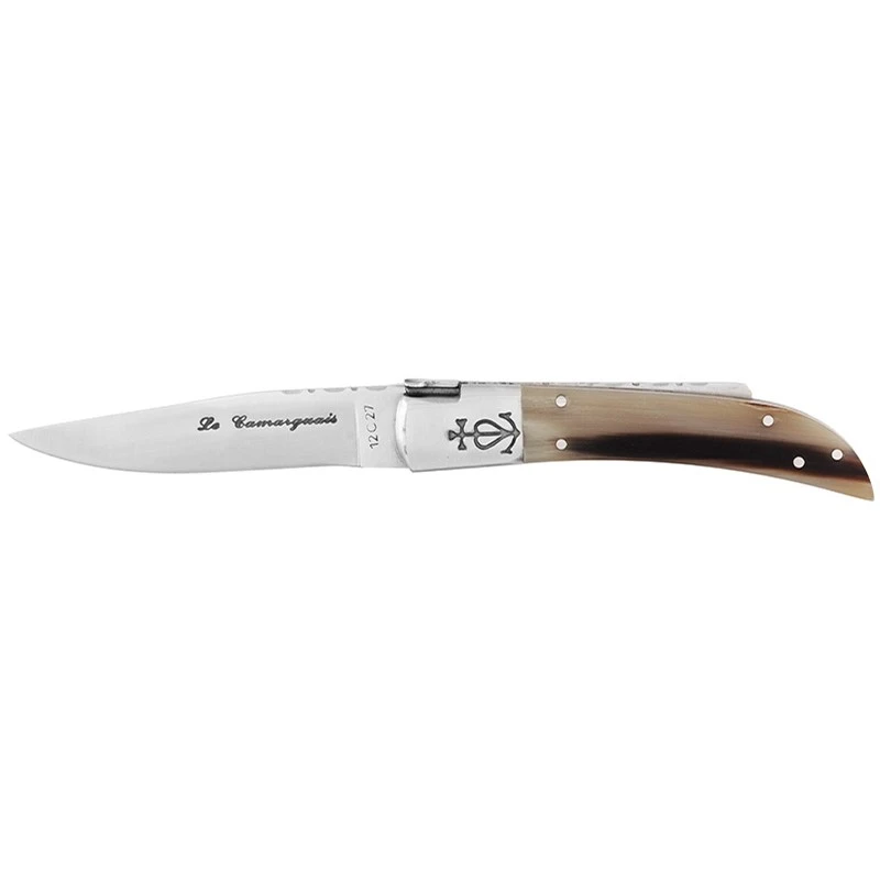 Ce couteau Le Camarguais n° 12 trident forgé pointe de corne intègre aussi une lame pliante de 105mm de long, fabriquée en acier inoxydable 12C27. Lisse et de profil drop point, la lame est décorée par l’inscription « Le Camarguais« , et personnalisable par gravure (voir bouton ci-dessous). Ce couteau Le Camarguais n° 12 personnalisé fera à coup sûr plaisir à une personne habitant ou adorant la Camargue, pensez-y ! Lame et ressort guillochés main.