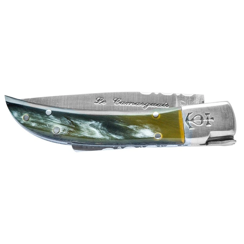 Le couteau Le Camarguais N°12 Trident soudé, manche corne brune, possède une lame de 105mm de longueur en acier inoxydable 12C27 sur laquelle on observe l’inscription « Le Camarguais » gravée. Une lame que vous pourrez également graver à votre tour en supplément (option facultative, voir bouton ajouter une gravure). Fabriqué de façon artisanale, ce couteau régional se décline de diverses façons afin de vous séduire toujours un peu plus.