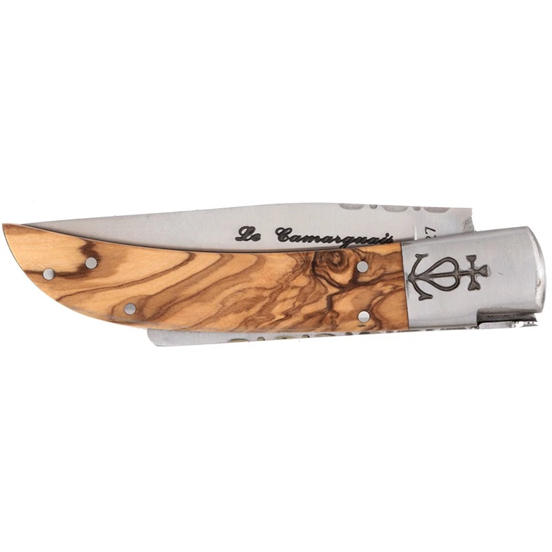 Moins onéreux que le forgé, le trident soudé apporte de l’élégance au couteau le Camarguais n° 12, tout en faisant référence à l’histoire des gardians. Mettant en avant la magnifique région du Sud de la France, à savoir la Camargue, ce couteau pliant plaira beaucoup à tous les adeptes de couteaux régionaux. Il possède un joli manche en bois olivier, de forme ergonomique, avec une mitre et sa croix Camarguaise au niveau de son extrémité, côté lame. La poignée en bois olivier naturel mesure 115mm de long, offrant ainsi un transport relativement simple en toutes circonstances. Ce couteau Le Camarguais n° 12 trident soudé intègre aussi une lame de 105mm de longueur en acier inoxydable 12C27. Tranchante et résistante notamment à la corrosion/rouille, elle est à personnaliser par les textes que vous voulez, face recto comme verso. À noter qu’elle est déjà marquée sur la face avant par l’inscription « Le Camarguais« , de quoi ravir tous les fans de la coutellerie artisanale 100% Française ! Existe aussi en version n° 10 trident soudé, un couteau identique mais légèrement plus compact.