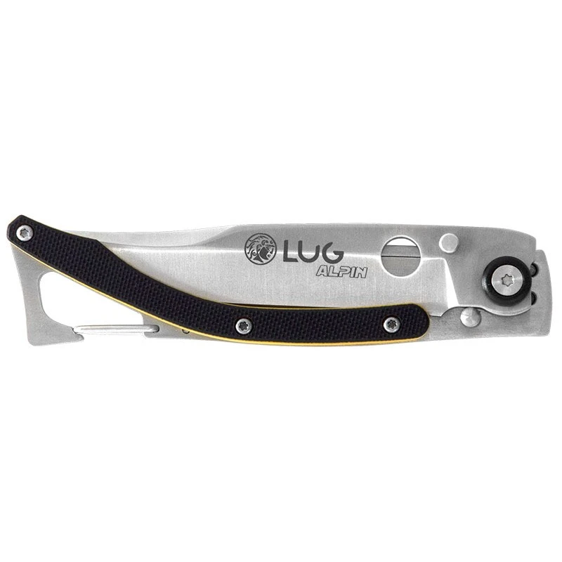 Le LUG Alpin SP1SJN possède un manche façon squelette construit en acier inoxydable gris pour la résistance à la corrosion, enrichi d’une zone courbée en G10 noir et liseré jaune. Une association astucieuse de couleurs qui fonctionne à merveille en raison du joli contraste : cela ne manquera pas d’attirer l’œil ! La poignée fait en sorte que le couteau soit simple à transporter au quotidien, déjà elle ne mesure que 11cm de long et intègre un mousqueton, clip de poche.