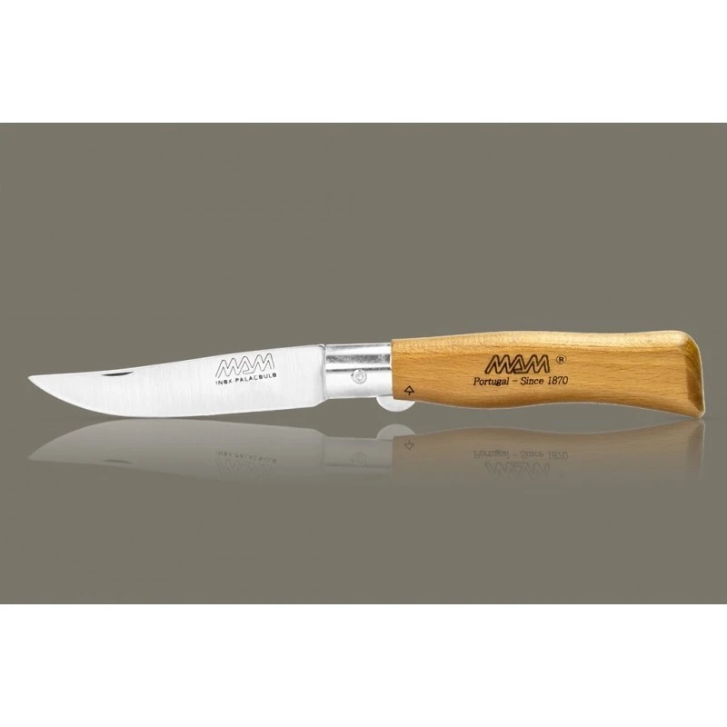 Léger, ce couteau MAM 2007 ne pèse que 49 grammes. Pourtant, il est résistant de part son manche en bois hêtre de 112mm de long qui est d’ailleurs décoré avec goût par le texte « MAM Portugal since 1870« . Agréable à prendre en main, le manche est aussi très ergonomique, de quoi pouvoir manier le couteau MAM avec aisance au quotidien. Au niveau de la lame, elle est fabriquée en acier inoxydable et mesure 90mm de long. Elle est marquée par le logo du fabricant Portugais MAM, vous pouvez personnaliser le verso contre un supplément financier.