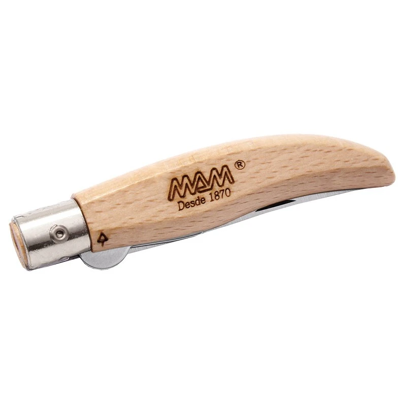 La coutellerie MAM est implantée à Palaçoulo au Portugal, elle bénéficie d’une large expérience puisque sa création remonte à 1870. Le modèle Iberica 2011 est caractérisé par un manche en bois de hêtre naturel au coloris relativement clair. Ce dernier est spécialement traité pour offrir une résistance accrue face à l’humidité. Sa forme légèrement incurvée et affinée en bout est à l’origine d’une très bonne ergonomie traduit par une prise main confortable. La longueur de la poignée est d’environ 9cm si bien que le couteau pliant pourra être aisément rangé dans la poche.