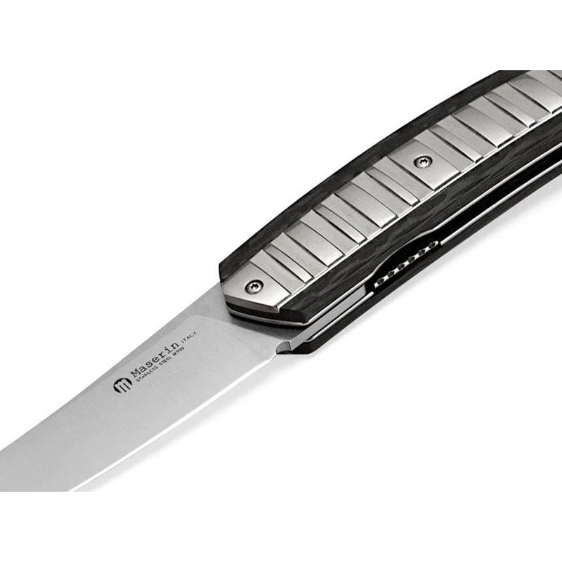 Le Maserin AM5 375.TT est un couteau de poche type gentleman à l’allure hyper élégante. Il possède un manche de 12cm de long conçu en fibre de carbone, avec inserts titanium gris créant ainsi un joli contraste noir/gris. D’ailleurs, au dos du manche, se trouve un clip de poche titanium servant à transporter le couteau Maserin AM5 avec toujours plus de facilité. De toute façon, sa faible longueur permet de le ranger facilement n’importe où (poche, sacoche, sac à dos …).