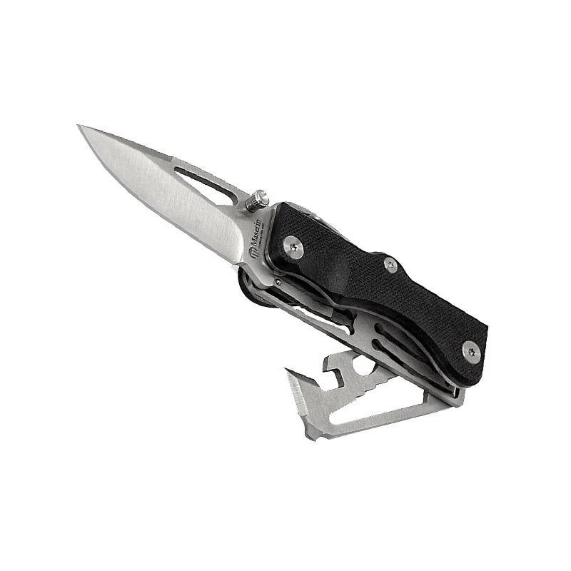 Le Maserin Citizen noir 564.N est un couteau multifonctions dont l’efficacité n’est plus à prouver. Il possède 6 fonctions toutes conçues en acier inoxydable 440 satiné : une lame à trou à bouton et cran intérieur, un décapsuleur, un ouvre-boîtes, un tournevis plat 3mm, clés hexagonales en 5 tailles ainsi qu’une règle. De ce fait, le modèle Maserin Citizen noir est très polyvalent et conviendra parfaitement pour l’aventure ou le bricolage. Ce couteau fabriqué en Italie est aussi facile à transporter du fait que son manche noir en G10 ne mesure que 75mm de longueur. De plus, un mousqueton est également présent afin de pouvoir accrocher le couteau multifonction Maserin Citizen noir n’importe où ! Couteau livré en boîte cadeau.