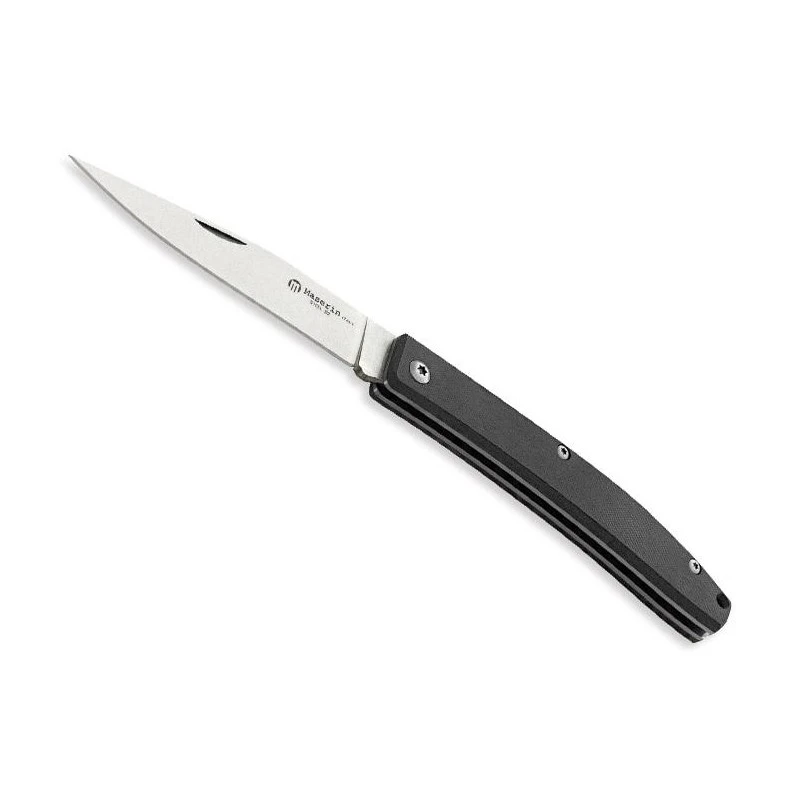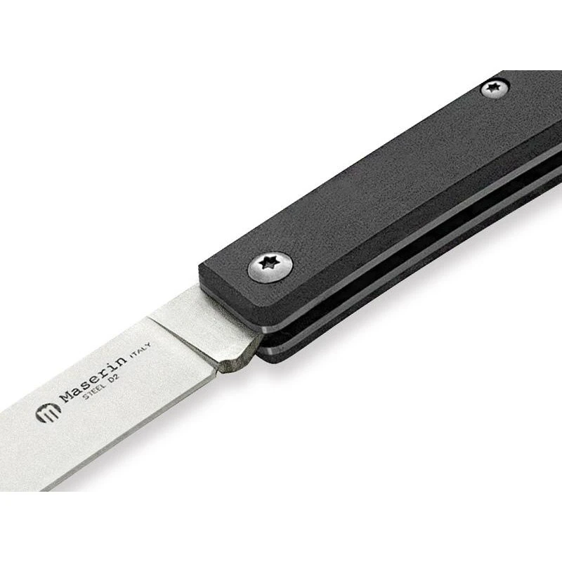 Ceux qui prĂ©fĂšrent les couteaux discrets vont beaucoup apprĂ©cier le Maserin EDC gentleman 164.MG. C’est un couteau de poche facile Ă porter et Ă transporter en raison de son faible poids (64g) et son manche de seulement 105mm de longueur. Un manche qui est fabriquĂ© en micarta gris et fixĂ© grĂące Ă des vis allen. En bout de manche, se trouve un trou servant Ă y passer de la corde ou une chaĂźne pour une encore meilleure transportabilitĂ©. Ce couteau Maserin EDC gentleman 164.MG, modĂšle gris, est pourvu d’une lame de 85mm en acier inoxydable D2 satinĂ© Ă cran, mĂ©canisme slip-joint. Une fine lame Ă bout pointu qui vous donnera entiĂšre satisfaction de par son tranchant, mais aussi sa rĂ©sistance Ă l’usure ou encore la rouille. On peut apercevoir sur la face avant de la lame le logo de la coutellerie Italienne Maserin. Il est Ă©galement possible de graver la lame sur les deux faces, voir bouton ci-dessous. Disponible en d’autres coloris de manche.