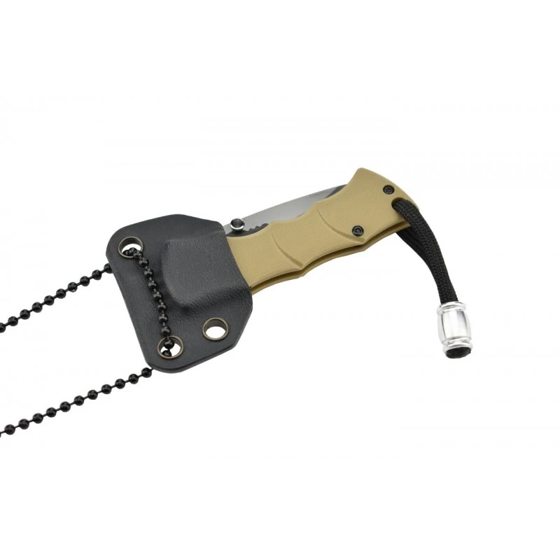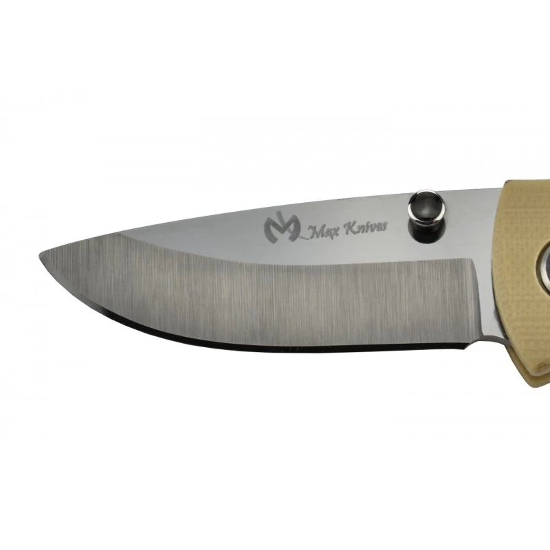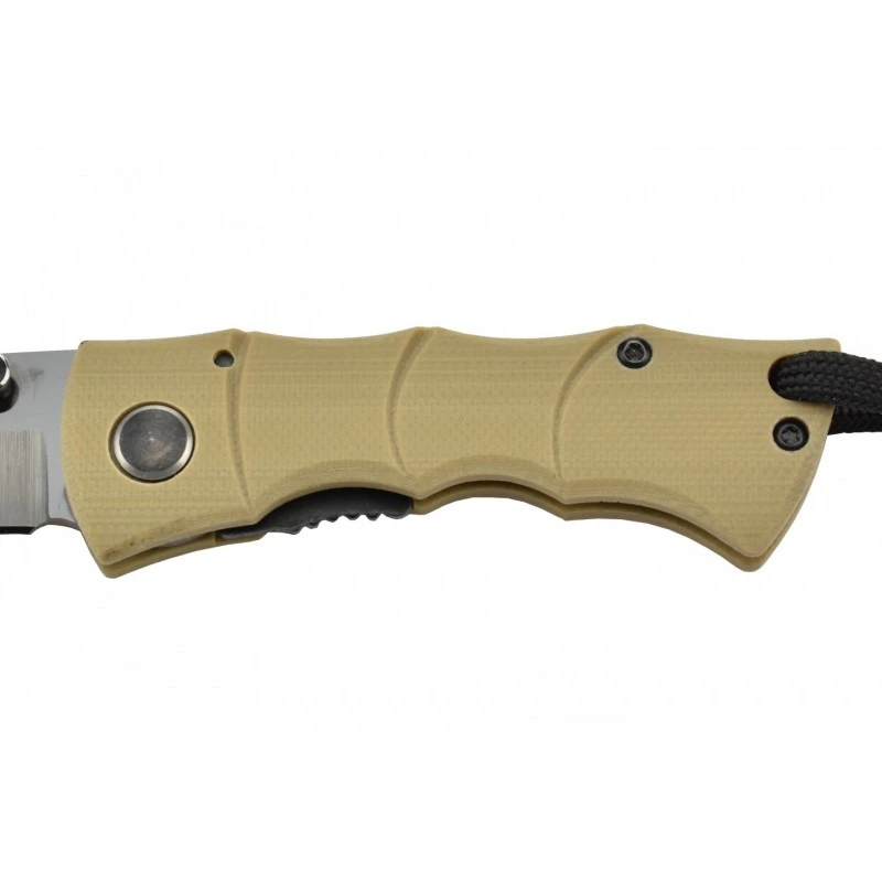 Petit couteau pliant Max Knives, modĂšle MKBAM OT, possĂ©dant un manche finition dĂ©sert sable conçu en G10, avec effet bambou trĂšs design, stylĂ©. Prise en main confortable et facilitĂ© de port grĂące Ă la longueur de 77mm en position fermĂ©e, avec lanyard et paracorde. Ă noter qu’ici, il s’agit d’un couteau pliant Ă verrouillage liner lock.