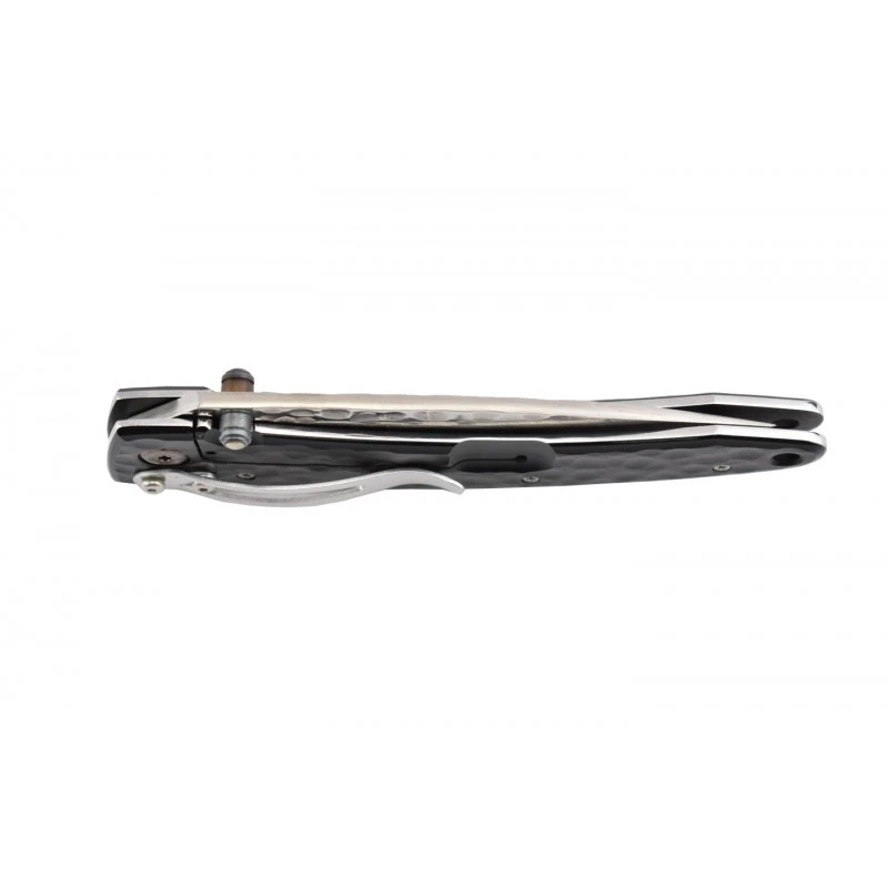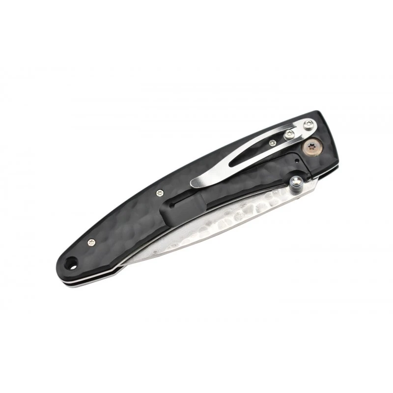 Le couteau Mcusta MC-114BD Shadow possède un manche noir en acier 420J2, de forme incurvée pour une excellente ergonomie en toutes circonstances (confort de prise en main). Intégrant un passe-lacet en bout, la poignée noire présente une finition martelée, pour une parfaite harmonie avec la lame martelée en damas. Au dos du manche, on retrouve un clip ceinture qui permettra à l’utilisateur de pouvoir transporter son couteau Mcusta MC-114BD très facilement. Longueur totale de la poignée : 112mm.