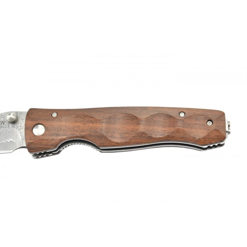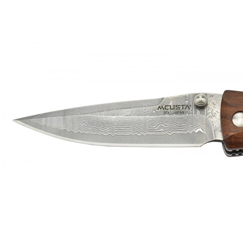 Ce couteau Mcusta MC-125D est muni d’une lame en acier inox Damas, avec le logo Mcusta en guise de dĂ©coration (Seki Japan). Il faut mentionner la prĂ©sence d’un double thumb stud facilitant grandement l’ouverture de la lame, le systĂšme de verrouillage est de type liner lock. Pour information, la lame damas mesure 93mm de longueur et comporte un bout pointu, elle est extrĂȘmement tranchante. Couteau pliant Mcusta fabriquĂ© Ă Seki au Japon.