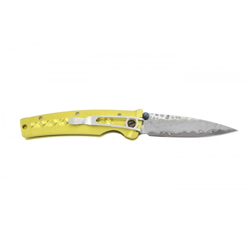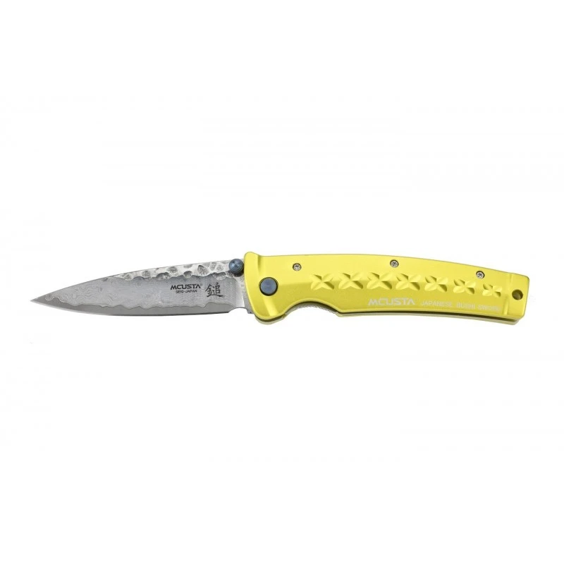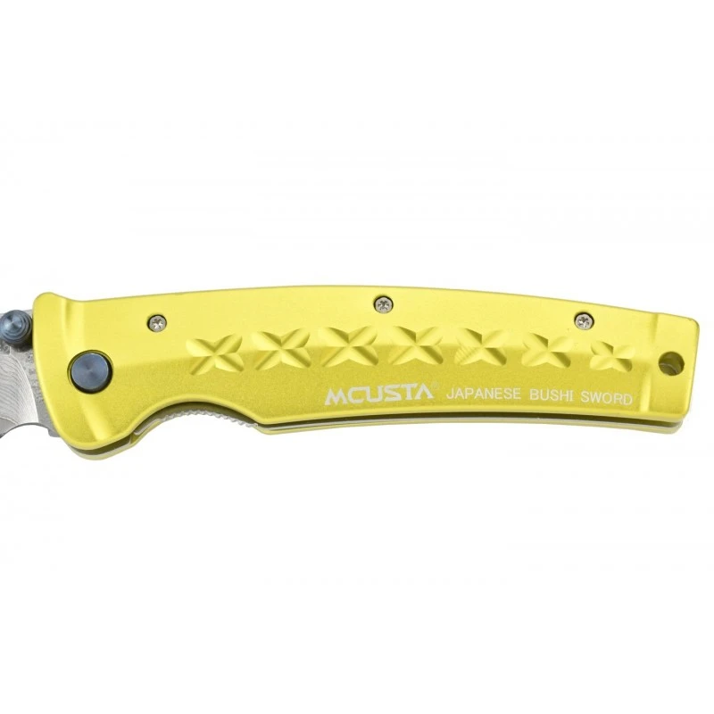 Ce couteau Mcusta Tsuchi MC-164D est dotĂ© d’un manche en aluminium anodisĂ© jaune de longueur 111mm avec motifs croix, et texte Mcusta Japanese Bushi Sword. FabriquĂ© au Japon, ce couteau pliant est relativement facile Ă transporter, notamment grâce au clip de poche au dos du manche jaune ainsi qu’au trou pour cordon ou lanière. Ă€ noter que le coloris jaune vif confère au couteau Japonais Mcusta Tsuchi MC-164D un look design, très original. L’ergonomie est Ă©galement très bonne avec une prise en main très confortable.