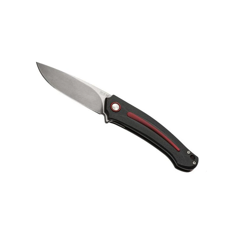 Sans surprise, la lame est elle conçue en acier M390 Bohler finition stonewashed avec flipper et cran intérieur, verrouillage liner lock. Elle mesure 85mm de longueur et a l’avantage d’être très tranchante ainsi que résistante à la corrosion. Possibilité de la personnaliser sur une ou deux faces au moyen d’un supplément financier. Le couteau MKM Arvenis by Fox Knives G10 noir/aluminium rouge est fabriqué à Maniago en Italie, preuve d’une très grande qualité.