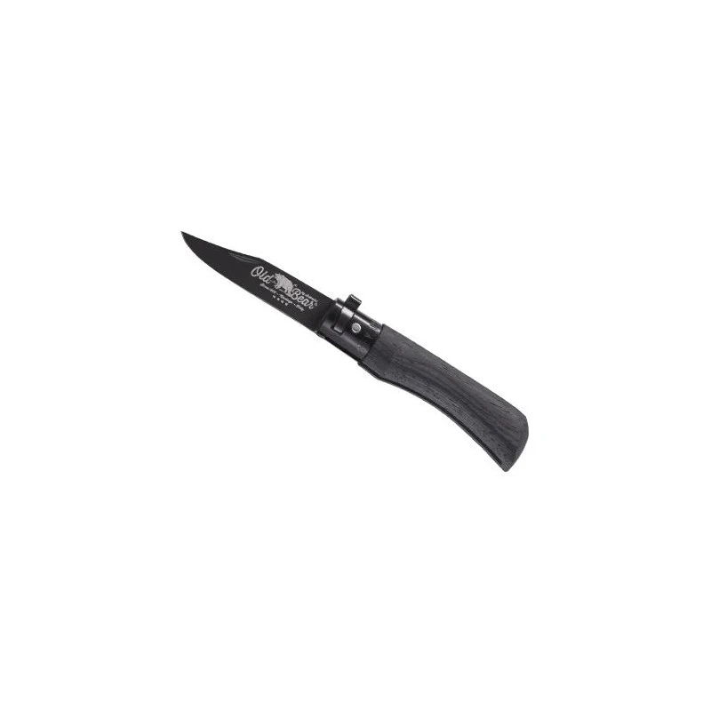 Voici le couteau Old Bear Total Black 311.S dans sa version taille S, avec virole de sécurité en aluminium anodisé noir. Un couteau pliant au design entièrement noir : la lame est fabriquée en acier 420 avec revêtement PTFE, avec en guise d’unique décor le logo Old Bear (Since 1925 – Maniago – Italy). Tranchante et robuste, la lame noire peut également être personnalisée par le texte de votre choix, au moyen d’une gravure (voir bouton ajouter une gravure ci-dessous). Côté manche, il est fabriqué en bois d’ayous stratifié noir et mesure 10cm de longueur ce qui confère une facilité de transport quotidienne. C’est simple, vous n’aurez aucune difficulté pour emporter partout avec vous le couteau Old Bear Total Black virole noire taille S durant les déplacements/mouvements. De qualité, ce couteau de poche est conçu et fabriqué artisanalement en Italie. Il est livré en boîte individuelle, avec certificat de contrôle qualité. Existe aussi en version plus grande (M, L, XL) et même en version virole grise en laiton nickelé.