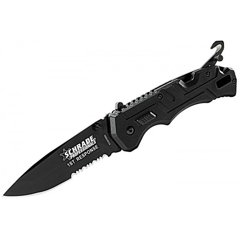 Le Schrade SCH911DBS 1ST Response est un couteau se destinant aux professionnels : forces de l’ordre, police, pompiers, secouristes et bien d’autres. Il possède une lame de forme drop point de 9cm construite en acier inoxydable 4034 à revêtement noir, pouvant être ouverte de deux façons. Soit en utilisant le bouton de pouce ambidextre ou l’actionneur de doigt au niveau de la colonne vertébrale. La lame bénéficie d’un bord lisse ainsi que denté afin de s’adapter au mieux à toutes les situations rencontrées. Elle se verrouille de façon efficace en position ouverte grâce au mécanisme liner lock.