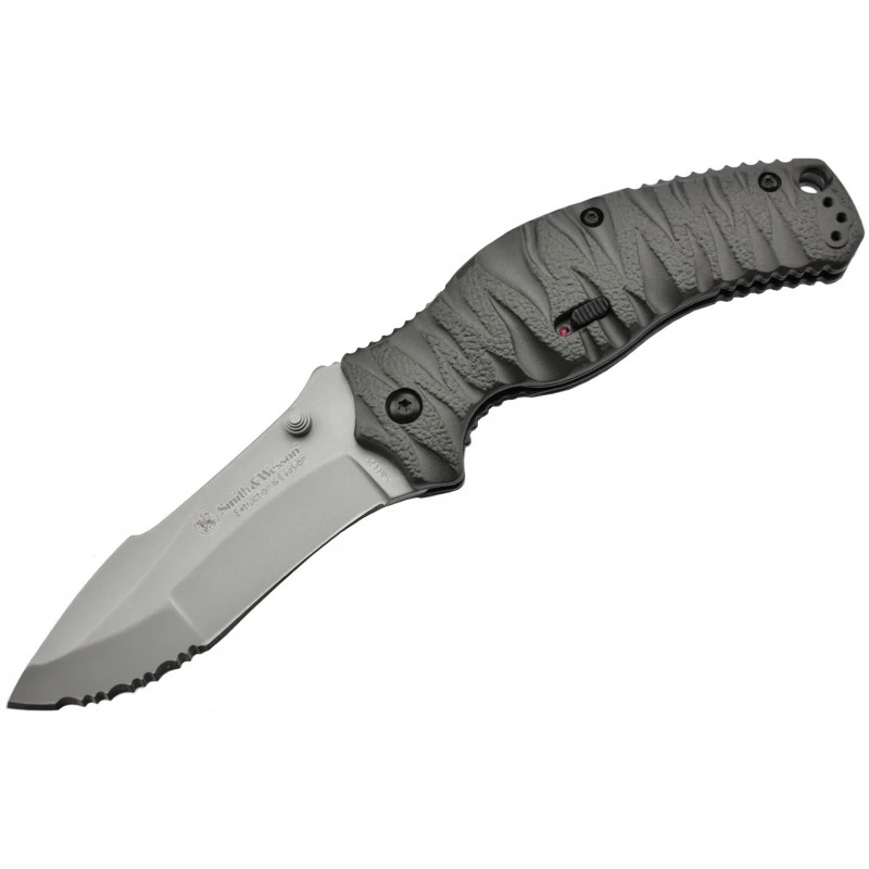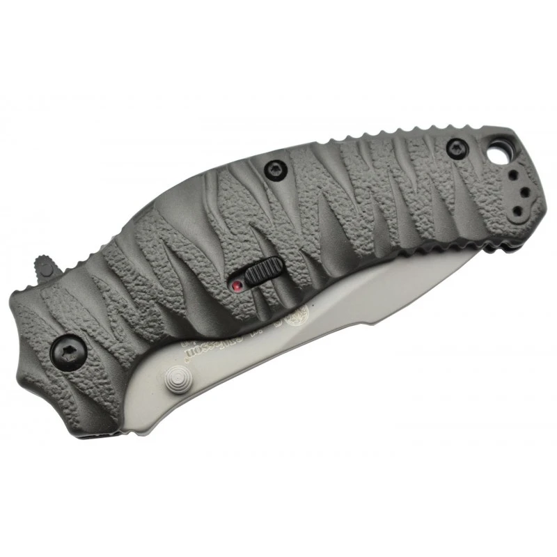 Le manche du couteau Smith & Wesson SWEE3S est conçu en aluminium gris, texturé pour accroître le style mais surtout renforcer l’ergonomie : la prise en main est excellente ! La poignée intègre un trou de dragonne ainsi qu’un clip ceinture de sorte à pouvoir plus facilement transporter le couteau au quotidien, sa longueur est de 11cm. Un verrou de sûreté est présent afin de garantir que la lame ne vienne pas s’ouvrir par inadvertance durant les déplacements.