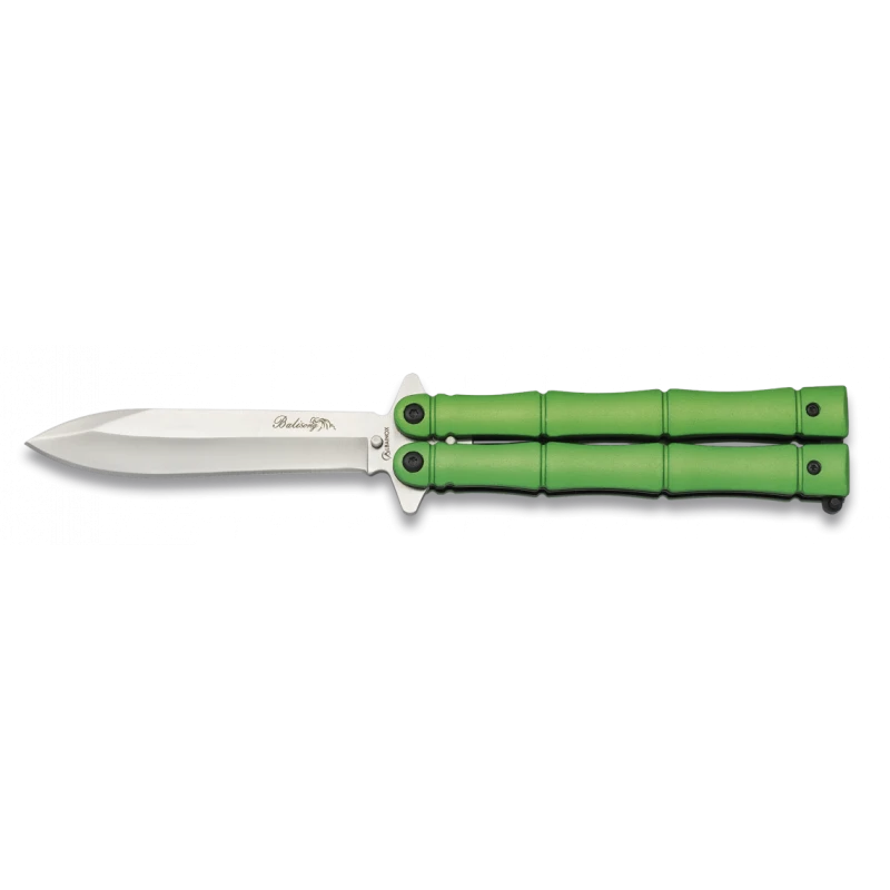 Ce couteau papillon sans anneau Albainox modĂšle Balisong 36227 est muni d’un manche squelette vert en aluminium. Le manche est qualifiĂ© de cette façon du fait que des lignes verticales sont prĂ©sentes : on a alors l’impression qu’il est composĂ© d’os. On pourrait Ă©galement dire que c’est un manche vert en bambou, il est trĂšs ergonomique et offre du confort Ă l’utilisateur au niveau de la prise et tenue de main.