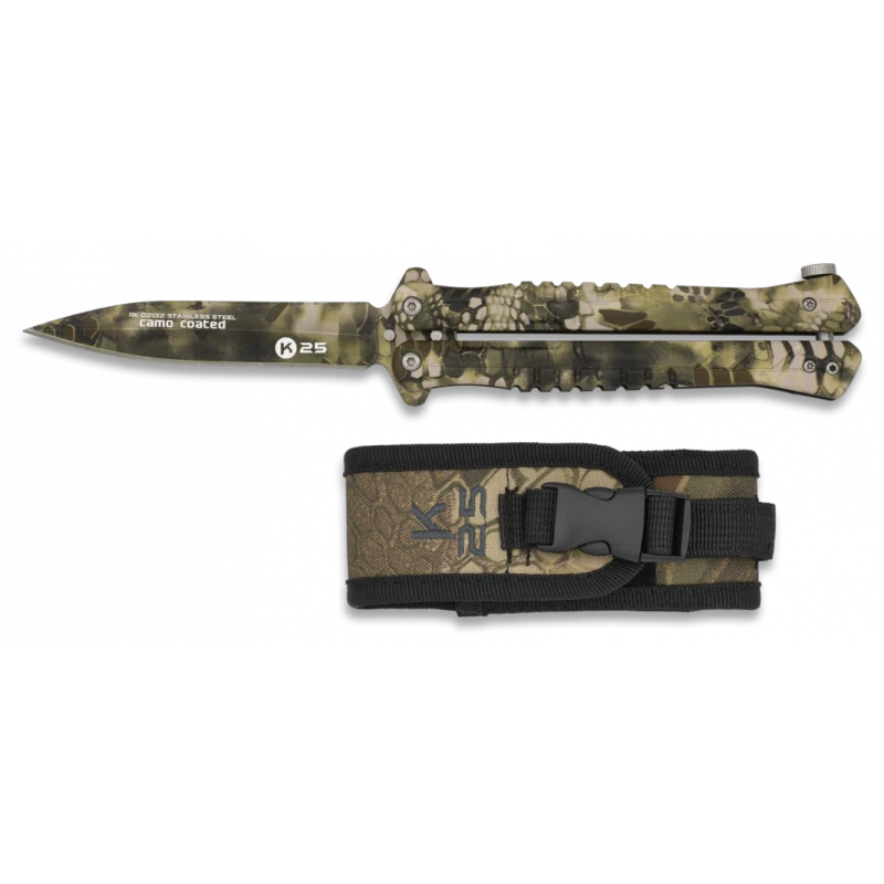 Conçu en Espagne, ce couteau papillon K25 Phyton Camo a un look d’enfer ! Vous l’apprécierez grandement pour sa lame de 10cm en acier inoxydable avec revêtement camouflage sable. Une lame qui d’ailleurs est décorée par le logo K25 en blanc. Le manche lui est fabriqué en aluminium sublimé lui aussi par un décor camouflage sable. Ce couteau papillon K25 Phyton 02132 fera le bonheur de tous les militaires, c’est une certitude ! Pour information, le manche mesure 127mm de longueur ce qui assure un transport relativement facile au quotidien. Très complet, le couteau balisong K25 Phyton Camouflage sable est livré avec son étui en nylon adapté comme vous pouvez le voir sur l’image. Un étui stylé signé K25 qui assure une protection de tous les instants lors des déplacements et mouvements !