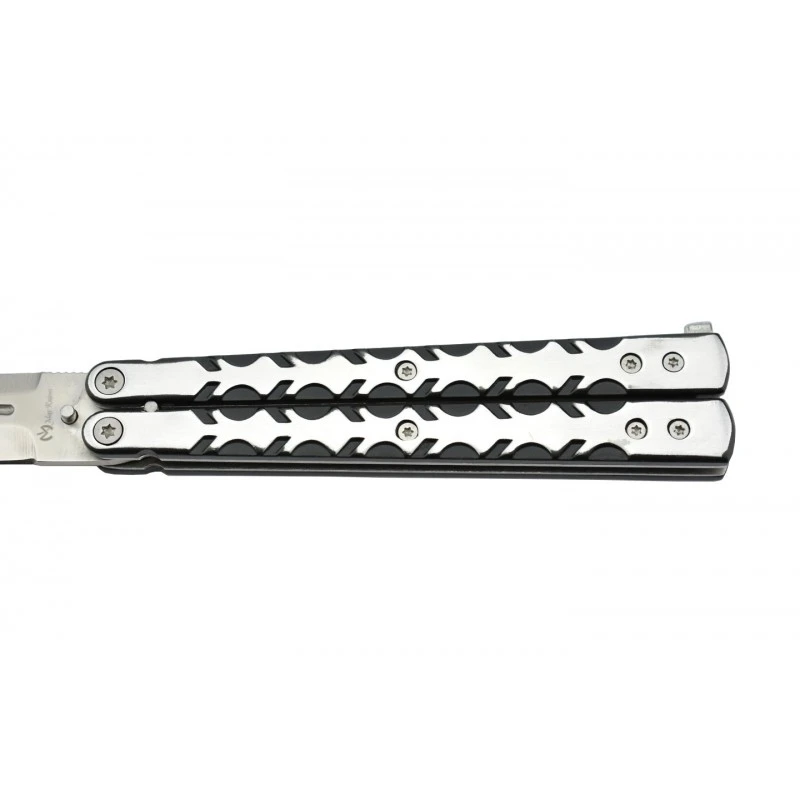 Ce couteau papillon Max Knives P27S est à la fois moderne et élégant en raison de son manche en acier décoré par de nombreux motifs abstraits noirs. Esthétique, le manche assure également des manipulations toujours très faciles, en plus, il assure également une facilité de transport grâce à sa petite taille. Le couteau papillon Max Knives P27S se rangera aisément dans une poche ou un sac à dos, de quoi permettre aux aventuriers de toujours l’avoir à proximité lors des aventures. Mais le Max Knives P27S, ce n’est pas qu’un joli manche, c’est aussi une lame tranchante conçue en acier inoxydable 440C. Une lame résistante à la corrosion de longueur 100mm que vous avez l’opportunité de personnaliser, prix de la gravure : 8,90€. Voici la longueur du couteau balisong Max Knives en position ouverte : 224mm contre 130mm en position fermée.