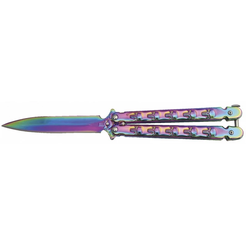 Le motif arc-en-ciel qui pare ce couteau papillon lui confère une allure spectaculaire. Chaque mouvement du manche révèle un dégradé de couleurs éblouissant, créant ainsi un effet visuel à couper le souffle. C’est un véritable plaisir pour les yeux.