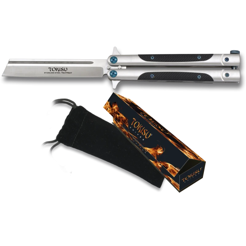 Ce couteau papillon Tokisu 02174 est muni d’une lame droite de longueur 10cm fabriquĂ©e en acier inox 7CR17MoV, un acier Chinois proche du 440A. Ă noter que l’on peut apercevoir sur la lame, le logo Tokisu avec juste en-dessous le typer d’acier utilisĂ©. Il est mĂȘme possible de graver la lame par le texte de son choix (voir bouton ci-dessous). Pour information l’Ă©paisseur de lame est de prĂ©cisĂ©ment 3,8mm. CĂŽtĂ© manche, il est fabriquĂ© en acier et G10 pour une Ă©lĂ©gance de tous les instants : un contraste juste sublime ! En plus d’ĂȘtre esthĂ©tique, la poignĂ©e est toujours aussi confortable et transportable (longueur de 135mm) : le couteau papillon Tokisu 02174 pourra se glisser sans problĂšme dans la poche. Conçu en Espagne, ce balisong vous sera livrĂ© avec son Ă©tui de protection en velours noir, trĂšs pratique lors des dĂ©placements et mouvements. LivrĂ© en boĂźte dĂ©corĂ©e avec fermeture magnĂ©tique (cf image du produit).